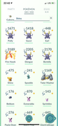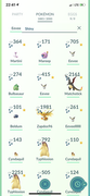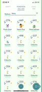 Heres the list of mine with no doubles, 57 different ones: Bulbasaur Ivysaur Venasaur Charmander Charmeleon Charizard Squirtle Wartortle Blastoise Pikachu Raichu Psyduck Golduck Golem Pinsir Magikarp Gyarados Eevee Vaporeon Jolteon Flareon Zapdos Dratini Dragonair Dragonite Chikorita Bayleef Meganium Cyndaquil Totodile Croconaw Feraligatr Mareep Flaafy Ampharos Espeon Umbreon Murkrow Pineco Granbull Larvitar Pupitar Tyranitar Zigzagoon Wingull Meditite Plusle Minun Roselia Wailord Swablu Altaria Shuppet Luvdisc Beldum Metagross Drifloon Unfortunately missed out on Cyndiquil and Beldum community days along with missing Articuno raid event. Moltres I did about 15 raids that day and came away with none.