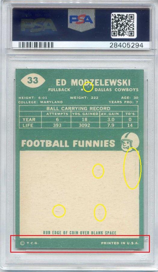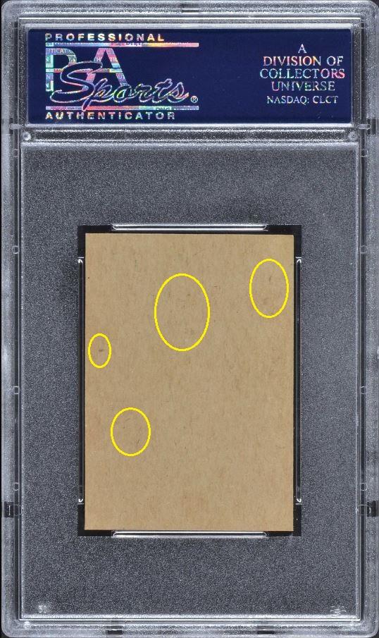 Buyer beware. There is color added all over on the front to remove snow in the background of the card. And, as is customary for Moser's cards, it has a PWCC eye appeal sticker, although it was not initially sold with one after the recoloring.