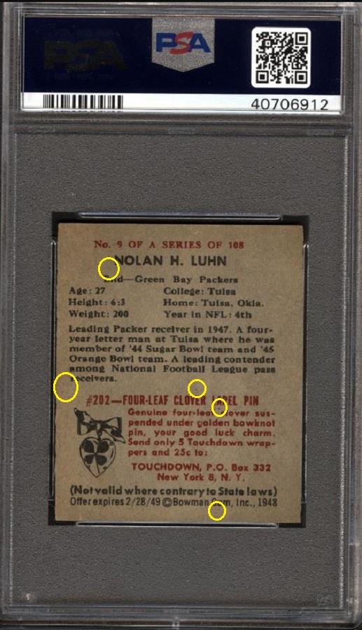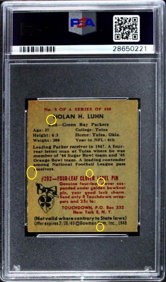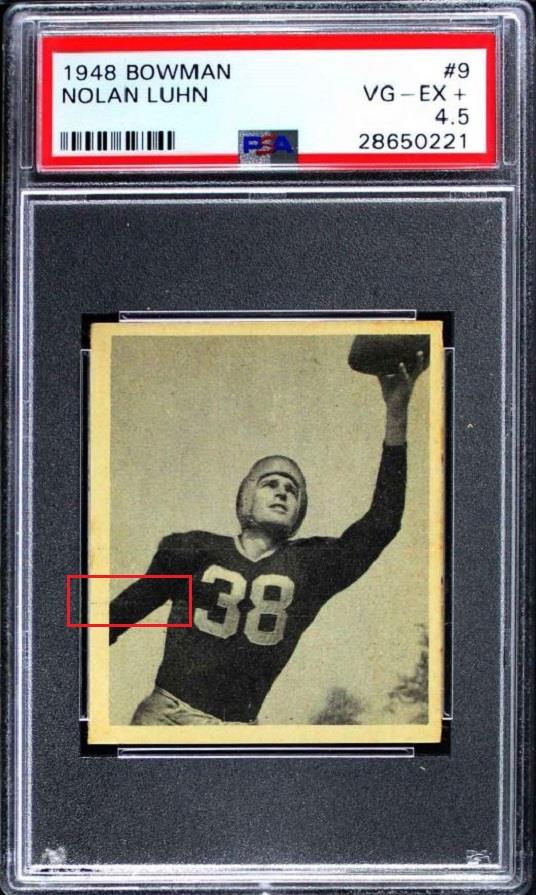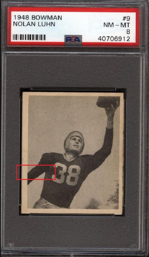 PSA Set Registry: none 1948 Bowman Nolan Luhn #9 Value gain of $254.99 This card was purchased by Ebay buyer ID bbcinv (Dennis Pevarnick) from Ebay seller deans_cards as a PSA 4.5 for $115.00 on March 09, 2018. VCP link: https://vintagecardprices.com/card/f...160335/PSA/4.5 Same card was sold by Ebay seller bbcinv (Dennis Pevarnick) as a PSA 8 for $369.99 on July 03, 2018. VCP link: https://vintagecardprices.com/card/f...9/160335/PSA/8 Yellow circles are print, fiber, or chipping identifiers. Red box identifies ink removed on the left white border that was initially caused by scuffing across the middle of the card which is still visible. ![]() ![]() ![]()