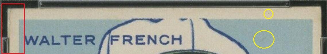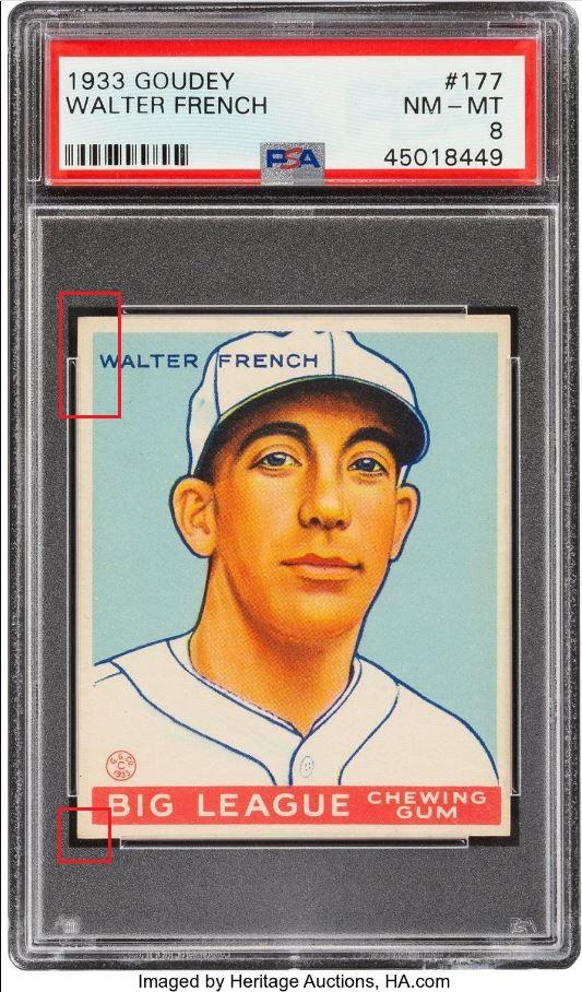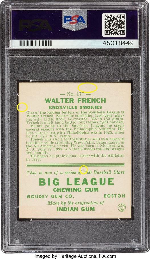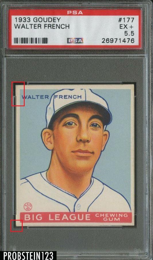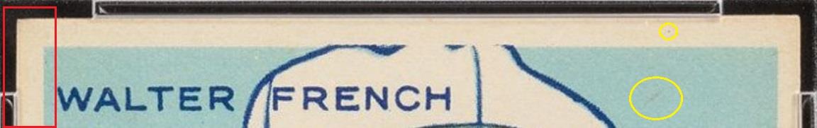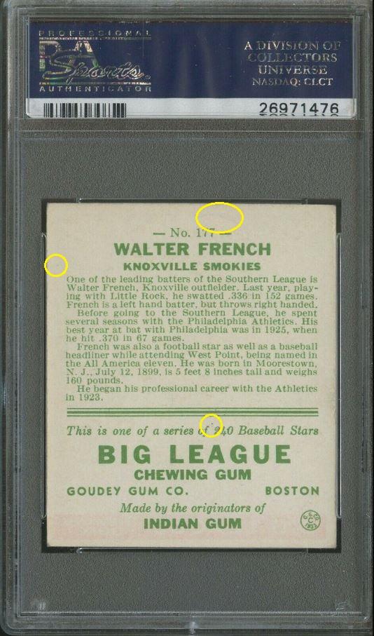 PSA Cert #45018449 PSA Set Registry: none 1933 Goudey Walter French #177 Value gain of $2,431.00 This card was purchased by Ebay buyer ID bbcinv (Dennis Pevarnick) from Ebay seller probstein123 as a PSA 5.5 for $89.00 on June 24, 2019. VCP link: https://vintagecardprices.com/card/b.../44479/PSA/5.5 Same card was sold by Heritage Auctions as a PSA 8 for $2,520.00 on February 23, 2020. VCP link: https://vintagecardprices.com/card/b...77/44479/PSA/8 Yellow circles are print, fiber, or chipping identifiers. Red boxes identify doctored upper and lower left corners and edge. ![]() ![]() ![]() ![]() ![]()