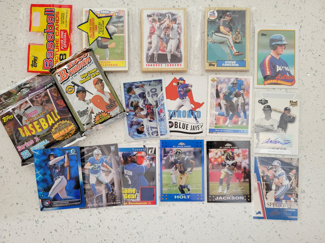 ![]() ![]() Half the box was wet and soft. Looks like it sat on the ground somewhere for a few days? I have a package lock box at the entrance to my street, so assuming the damage happened somewhere in transit. The bad news is that a few things had to be tossed. A couple of 8x10s, there were some lanyards, an action figure toy and a couple of cards (only a few). The good news is that 90% of the box was salvageable. Woo! This is what I (a Blue Jays and Lions fan) scooped from it: ![]() Ripped the 87 rack pack and pulled a Bo Jackson rookie I snagged a new Large Priority box, replenished it with a good amount of stuff, so it's full up again. Will be sending out to Jutt tomorrow. The box lives on!