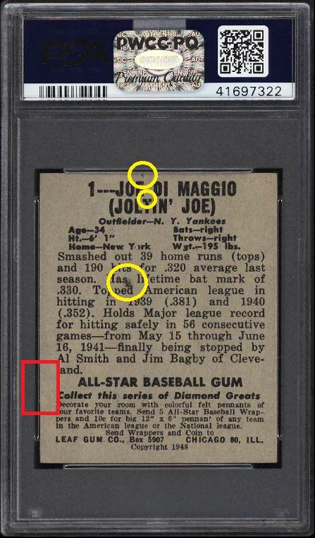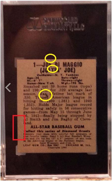 *This alteration is not an easy notice due to the blurred SGC images. Card was purchased by whitman111 (Gary Moser) as a SGC-1.5 from seller pepto23 for $499.00 on August 28, 2017. Worthpoint link: https://www.worthpoint.com/worthoped...ees-1884114806 Same card was sold by PWCC as a PSA-3 on Nov. 08, 2018. PWCC Marketplace link: https://www.pwccmarketplace.com/items/1863759 It's too hard to tell if anything else was done besides a very slight trim on the right edge which sharpened the corners. I can see how this may not be caught by a grader because it is so slight. Although I could see it by eye, I was able to confirm the trim by blowing up a portion of the left back which included the left edge and a whole word of type. I marked on a piece of paper the width from the edge to the right edge of the letter 'd' on the word 'land' (as shown). The center points are different on both images. I found several other high-end cards including a 1957 Unitas and a 1955 Clemente but couldn't see what changed on the cards in order to receive a bump in grade. The Unitas had a stain removed from the back but the grade stayed the same from a SGC-6 to a PSA-6. There was more than likely a monetary gain since both were sold by PWCC. ![]() ![]() ![]() ![]() ![]()