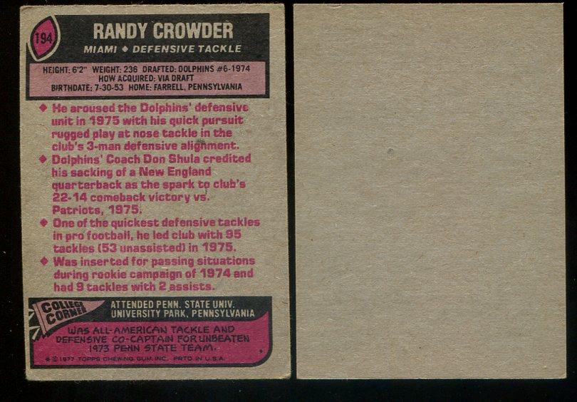 A 1977 Topps Randy Crowder #194 blank back. The sheet either by error didn't get backed, was a doubled up sheet as it traveled through the press (a properly set double sheet detector would have prevented this), or was intentional. Anyones guess. Crowder spent time in jail for selling a pound of cocaine to an undercover cop. He is also the father of former NFL player Channing Crowder. ![]()