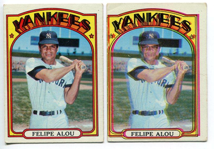 1972 Topps #263 - Felipe Alou One with severe registration issues and miscut and the other a comparable normal card. The Alou brothers actual last name is Rojas which is the paternal last name. Alou was the maternal (secondary) last name. When a scout saw his name was Felipe Rojas Alou (how it's done in Spanish) he assumed that Alou was his last name and Rojas was his middle name. Felipe just left the mistake uncorrected as well as his brothers.