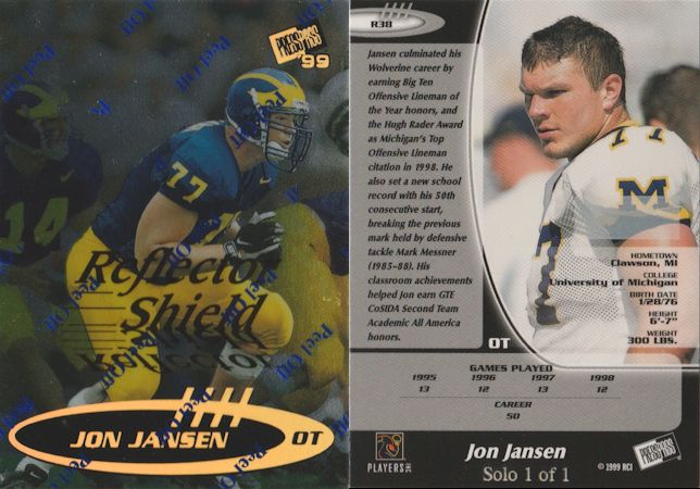 ![]() Here's my first pack pulled 1/1. 1999 Press Pass Football Jon Jansen Reflector Solo. Odds on those - 1:44,100 packs or 1:1,378 boxes. GO BLUE! |