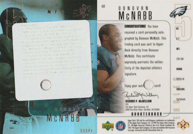 Thanks for the kind words on the Solo Jon Jansen above. It was a pretty awesome card to pull back then. I've never seen another but know the McNabb was pulled at some point.