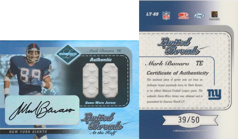 Here's one just a bit into the 2000's. Maybe a year over 'early' but cool enough I wanted to share it now that it's scanned. I wonder if Mark will ever make the HOF. 2003 Leaf Limited Mark Bavaro auto/jersey /50 LT-69 And speaking of McNabb... ![]() 1999 SPX Donovan McNabb long expired auto redemption Last edited by Devlyn; 06-02-2016 at 11:36 PM. |