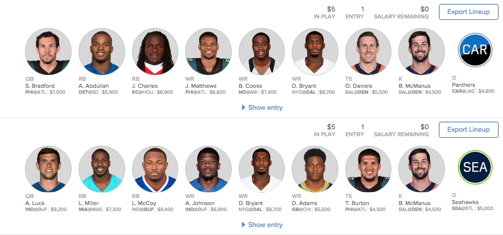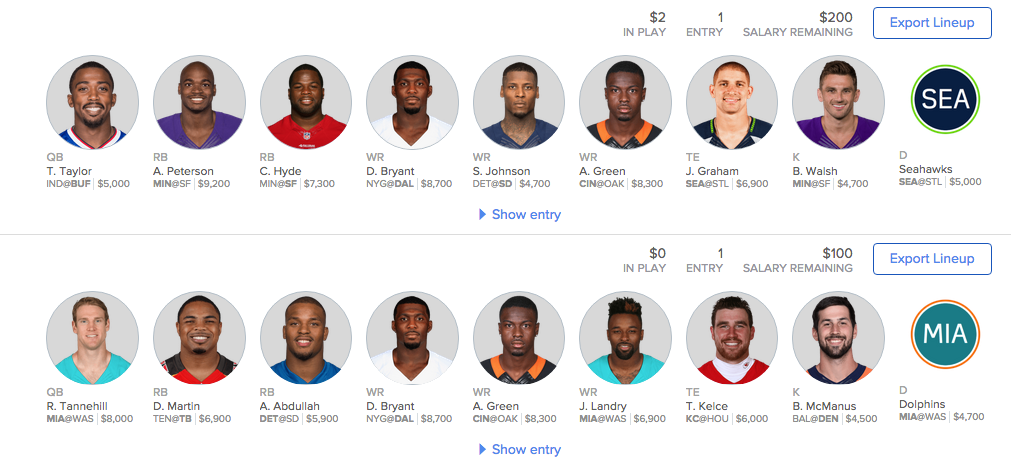 A lot. With the overlay and I've spent the last hour "sniping" new player H2H's on FD... I have 5 different GPP teams on FD in the big tourneys. I've also got a fair amount of action running on DK, but not as much $ as FD. I've got a bit on Yahoo hunting their overlay.