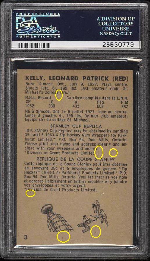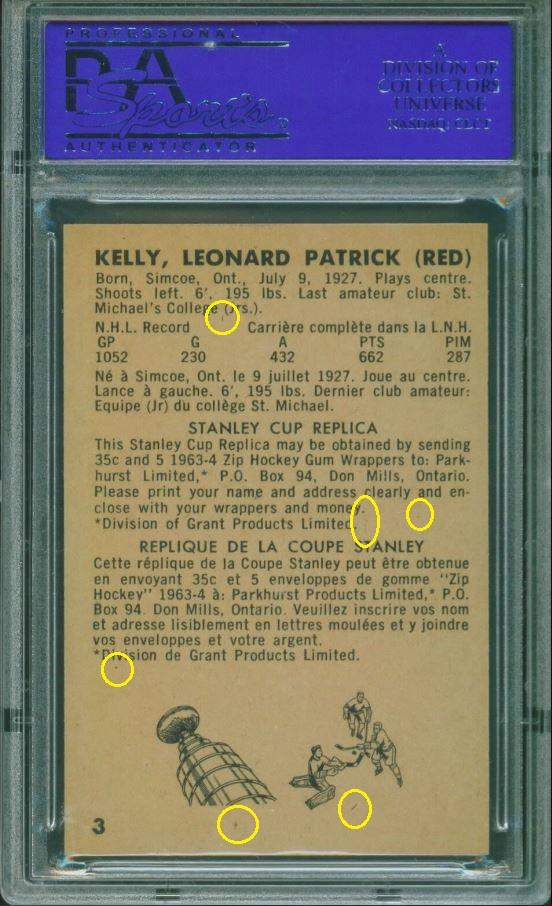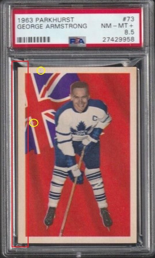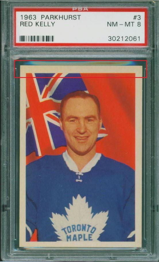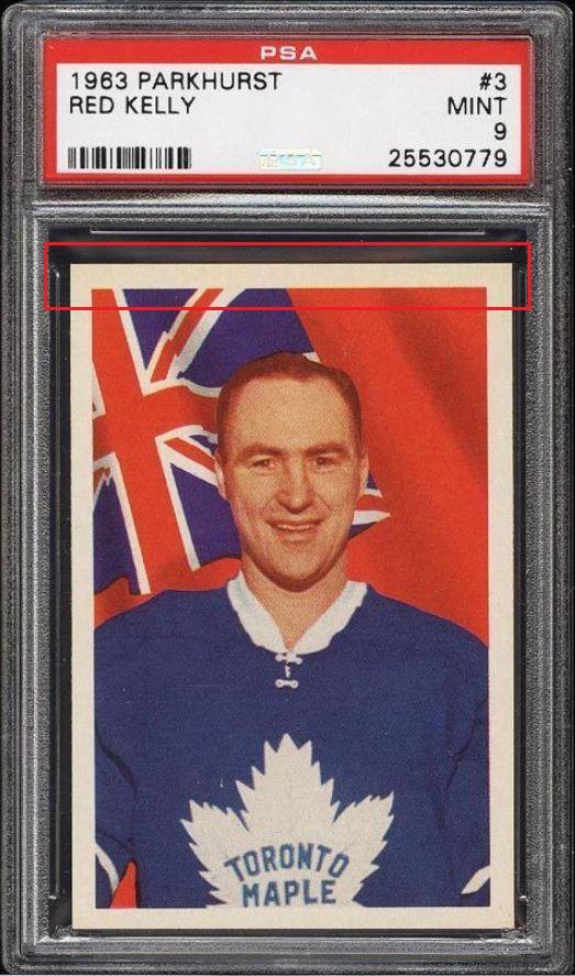 1963 Parkhurst Red Kelly #3 Value gain of $63.00 Set Registry: none found This card was purchased by masked Ebay ID b***y (card-buyer) from Ebay seller stevenovella as a PSA 8 for $29.00 on January 14, 2016. Same card was sold by PWCC (Brent and Betsy Huigens) as a PSA 9 for $92.00 on June 28, 2016. Yellow circles are print, fiber, or chipping identifiers. Red box identifies trimmed top edge. ![]() ![]() ![]() ![]() ![]() ![]()