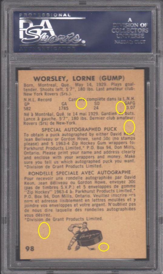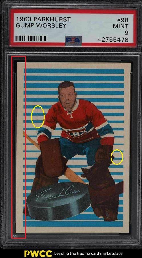 1963 Parkhurst Gump Worsley #98 Value gain of $91.14 Set Registry: no info This card was purchased by masked Ebay ID e***c (irvinecardco) from Ebay seller foxblackhawk as a PSA 8 for $73.36 on August 19, 2018. Same card was sold by PWCC (Brent and Betsy Huigens) as a PSA 9 for $164.50 on January 26, 2021. Yellow circles are print, fiber, or chipping identifiers. Red box identifies trimmed left edge. ![]() ![]() ![]() ![]()
