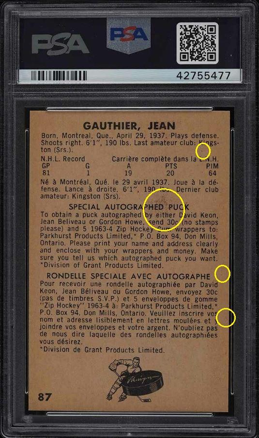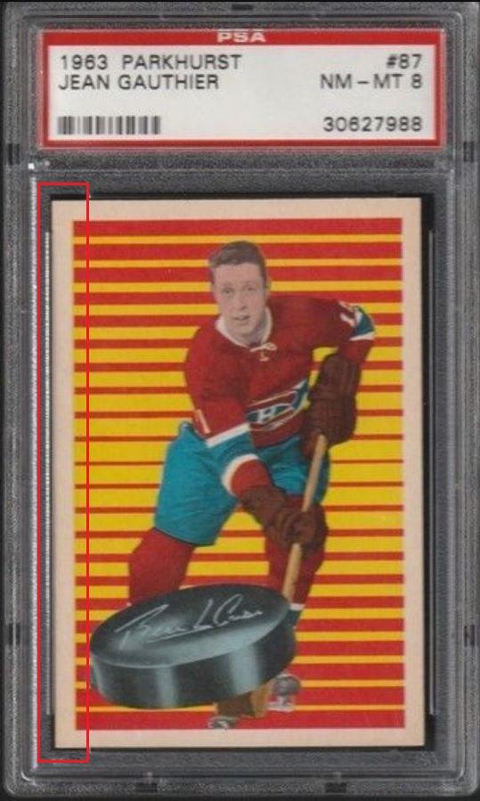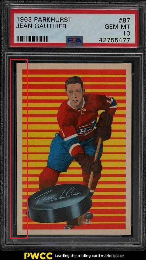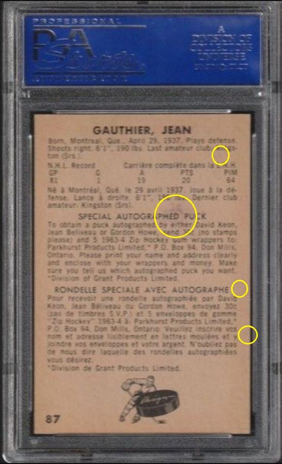 their trimmed cards on Ebay via anonymous consignment through PWCC until they were outed. They appeared to have turtled up for a little over a year before resuming to dump altered cards once again using PWCC. 312 outed them in August of 2019. This and the card above were sold in January of 2021. PSA Cert #42755477 1963 Parkhurst Jean Gauthier #87 PSA 10 - pop 2 Value gain of $1,735.00 Set Registry: George's Gems This card was purchased by masked Ebay ID e***c (irvinecardco) from Ebay seller premiersalesgroups as a PSA 8 for $40.00 on September 26, 2018. Same card was sold by PWCC (Brent and Betsy Huigens) as a PSA 10 for $1,775.00 on January 26, 2021. Yellow circles are print, fiber, or chipping identifiers. Red box identifies trimmed left edge. ![]() ![]() ![]() ![]() ![]() ![]() ![]() ![]()