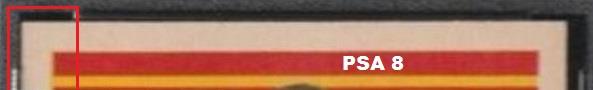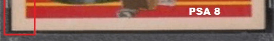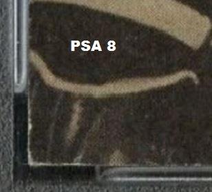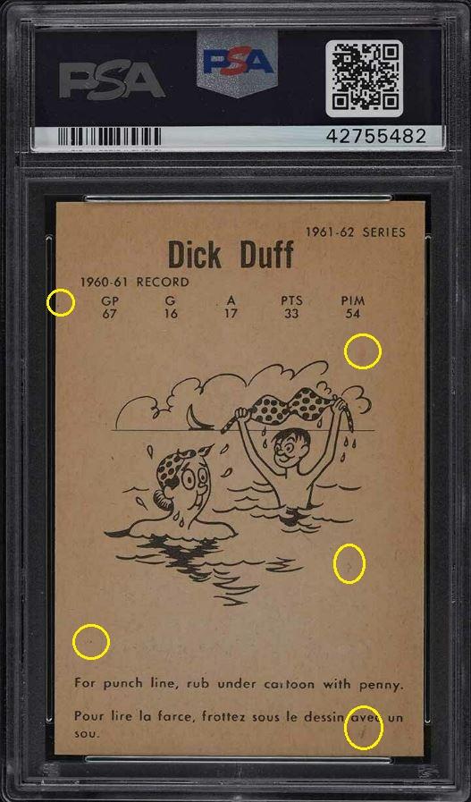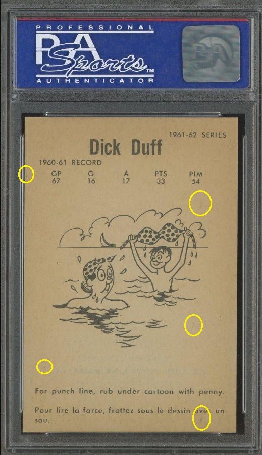 1961 Parkhurst Dick Duff #12 Value gain of $90.05 Set Registry: none found This card was purchased by masked Ebay ID e***c (irvinecardco) from Ebay seller probstein123 as a PSA 8 for $38.00 on October 22, 2018. Same card was sold by PWCC (Brent and Betsy Huigens) as a PSA 9 for $128.05 on January 26, 2021. Yellow circles are print, fiber, or chipping identifiers. Red box identifies trimmed left edge. The right edge is lightly trimmed too but I chose to focus on the left. ![]() ![]() ![]() ![]() ![]() ![]()