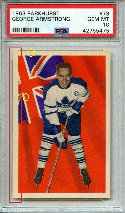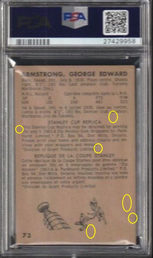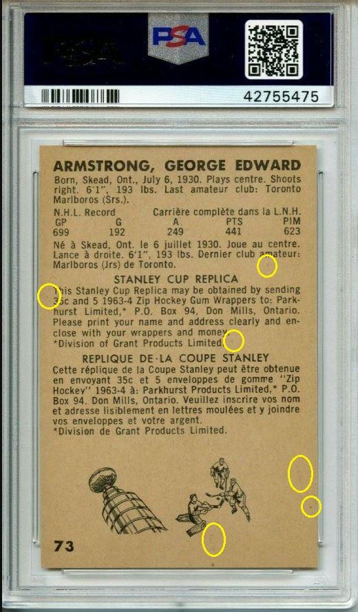 This one was sold at a show or somewhere else that did not trigger an online transaction record. The PSA 10 seller likely purchased it from one of the OCSI guys. PSA Cert #42755475 1963 Parkhurst George Armstrong #73 PSA 10 - pop 9 Value gain of n/a (Sale is by secondary seller) Set Registry: TheSpiffDog This card was purchased by masked Ebay ID e***c (irvinecardco) from Ebay seller premiersalesgroups as a PSA 8.5 for $60.00 on September 26, 2018. Same card was sold by julian691964 as a PSA 10 for $300.00 on February 22, 2020. Yellow circles are print, fiber, or chipping identifiers. Red box identifies trimmed left edge. ![]() ![]() ![]() ![]() ![]()