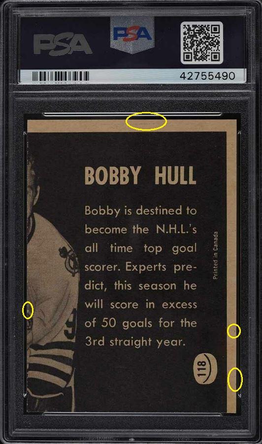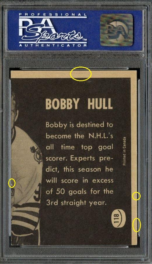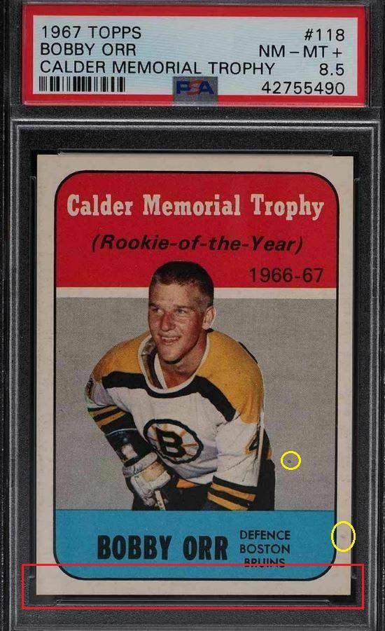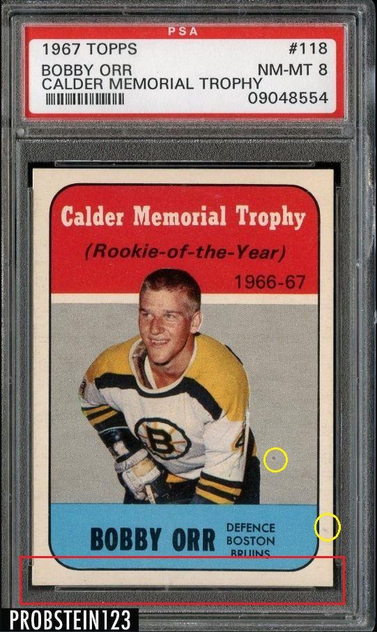 1967 Topps Bobby Orr #118 Calder Memorial Trophy Value gain of $378.69 Set Registry: Jet This card was purchased by masked Ebay ID e***c (irvinecardco) from Ebay seller probstein123 as a PSA 8 for $316.31 on August 30, 2018. Same card was sold by PWCC (Brent and Betsy Huigens) as a PSA 8.5 for $695.00 on January 26, 2021. Yellow circles are print, fiber, or chipping identifiers. Red box identifies trimmed bottom edge. ![]() ![]() ![]() ![]() ![]()