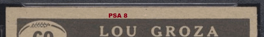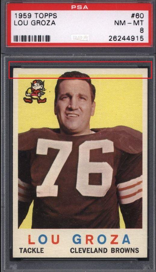 At one time there were two 1954 Bowman PSA 10 Gordons. The other one was submitted by Johnny Adams, Jr. and had been outed as trimmed by Superdan and eventually deactivated by PSA leaving just this Pop 1 that was submitted by a known card trimmer. ![]() PSA Cert #27755634 1959 Topps Lou Groza #60 Value gain of $146.51 Set Registry: none found This card was purchased by masked Ebay ID b***y (card-buyer) from Ebay seller just_collect as a PSA 8 for $40.99 on December 11, 2016. Same card was sold by PWCC (Brent and Betsy Huigens) as a PSA 9 for $187.50 on October 23, 2017. Yellow circles are print, fiber, or chipping identifiers. Red box identifies trimmed top edge. ![]() ![]() ![]() ![]() ![]() ![]()