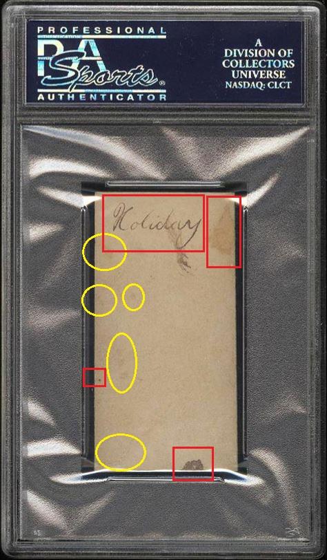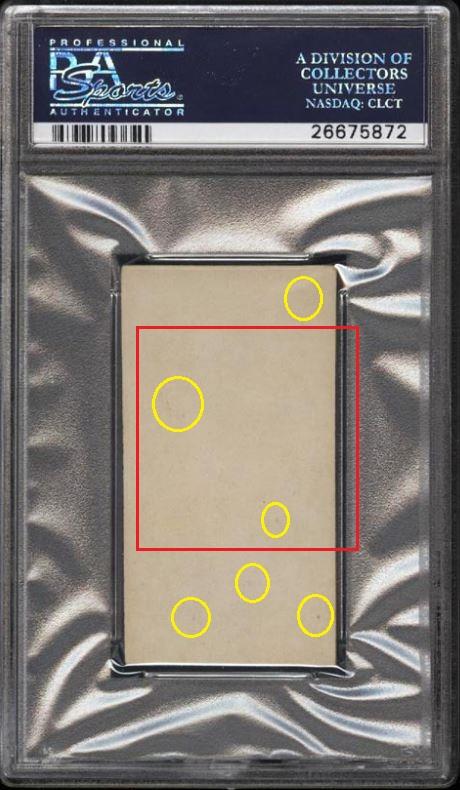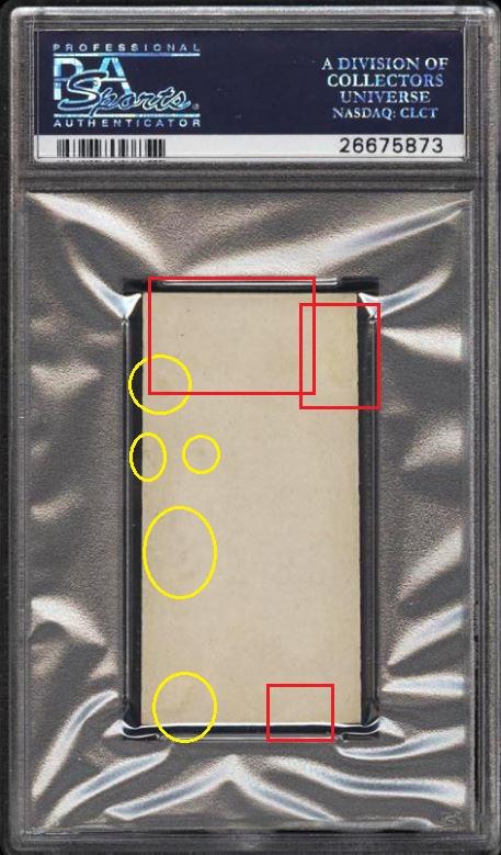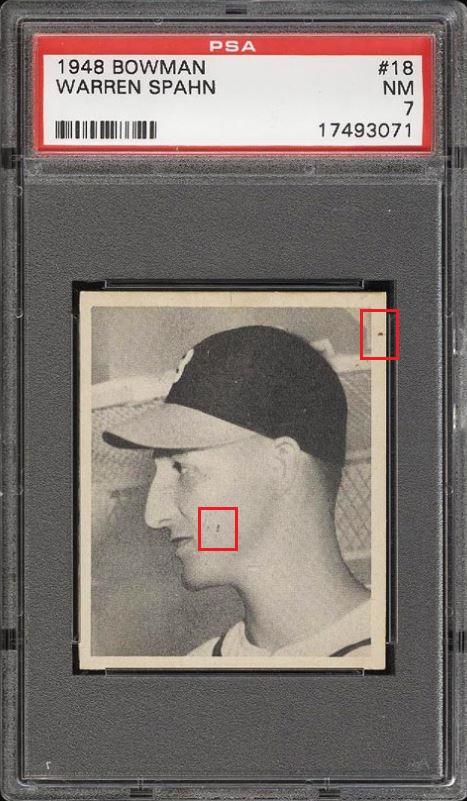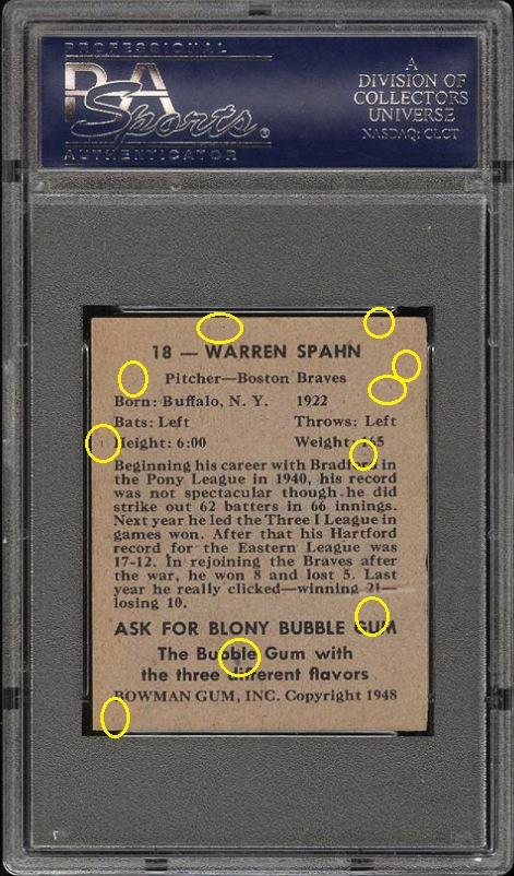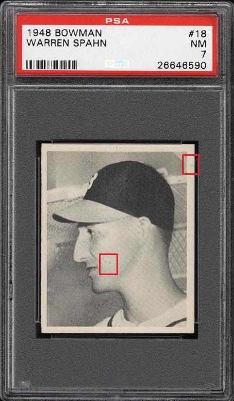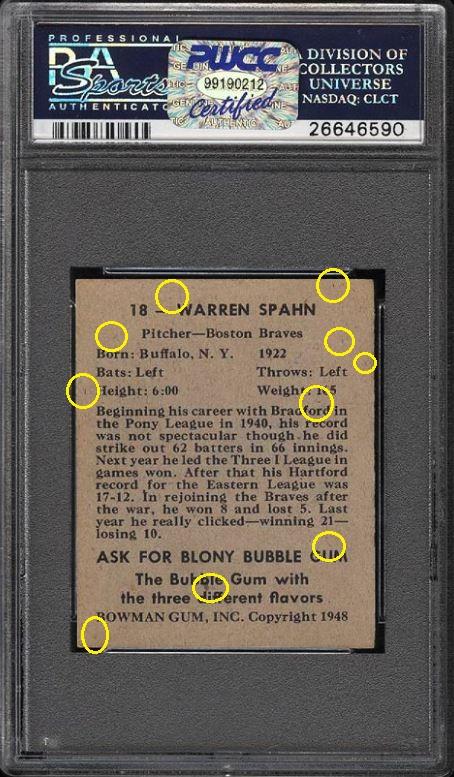 PSA Cert #26646590 1948 Bowman Warren Spahn RC #18 Value gain of $88.56 This card was sold by PWCC to whitman111 (Gary Moser) as a PSA-7 on October 12, 2016 for $637.99. PWCC Marketplace link: https://www.pwccmarketplace.com/items/1362187 Same card was sold by PWCC as a PSA-7 for $726.55 on March 13, 2017. PWCC Marketplace link: https://www.pwccmarketplace.com/items/1436308 PWCC note from the second PSA-7 listing description: "Harshly assessed by PSA and could easily have graded much higher." IE: They didn't get the grade bump they were hoping for... Yellow circles are fiber or print mark identifiers. Red squares identify areas of stain/spot/print flaw removal. ![]() ![]() ![]()