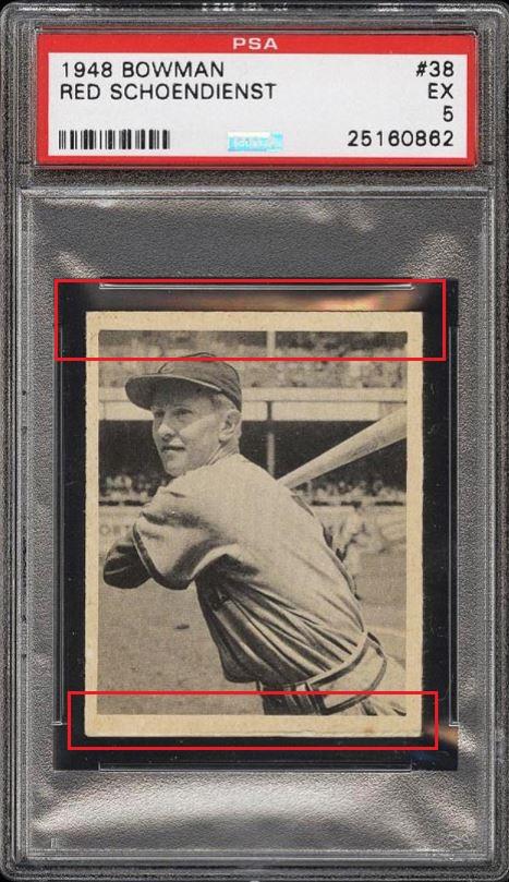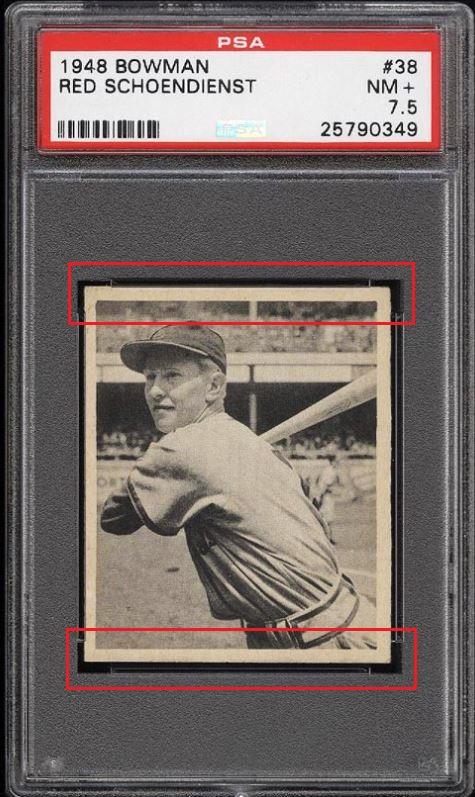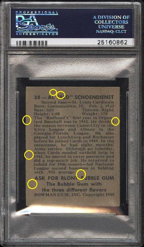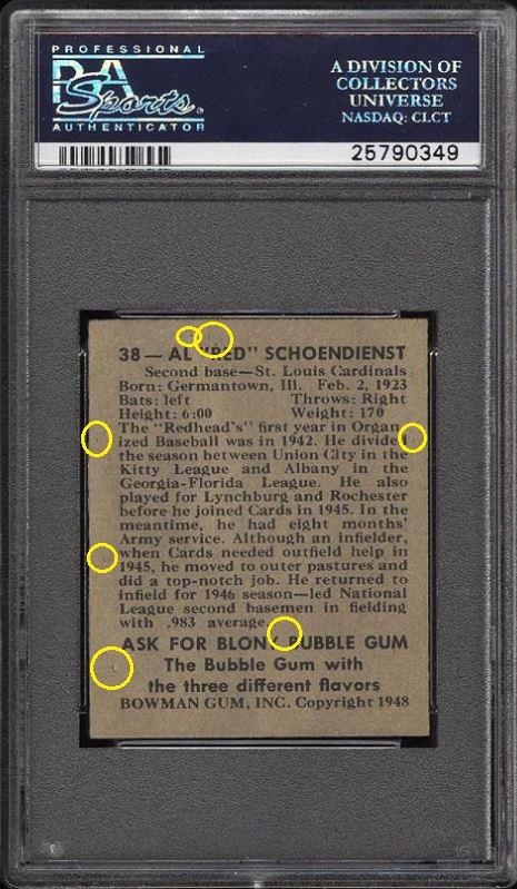 1948 Bowman Red Schoendienst RC #38 Value gain of TBD This card was sold by PWCC to whitman111 (Gary Moser) as a PSA-5 on February 07, 2016 for $145.19. PWCC Marketplace link: https://www.pwccmarketplace.com/items/1205899 Same card was sold by PWCC as a PSA-7.5 for an unknown amount on July 14, 2016. PWCC Marketplace link: https://www.pwccmarketplace.com/items/1305274 PWCC note from the PSA-5 listing description: "Some heavy bumps to the bottom edge downgrade." Yellow circles are fiber or print mark identifiers. Red squares identify areas of obvious trimming. ![]() ![]() ![]()