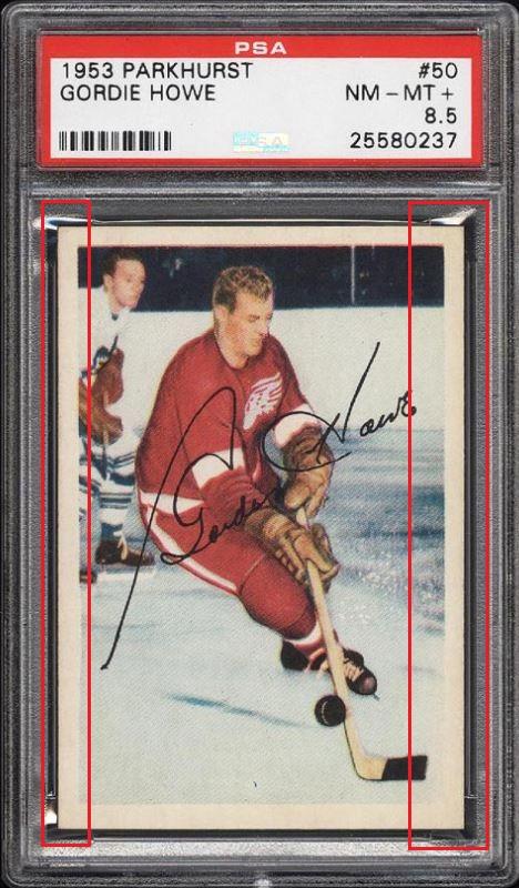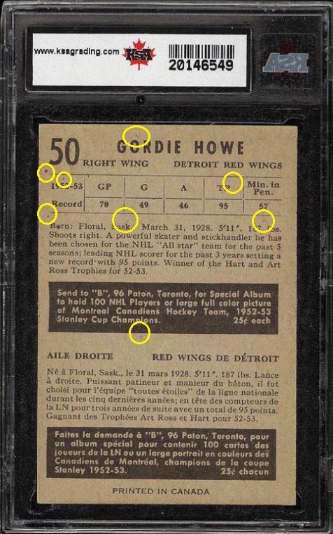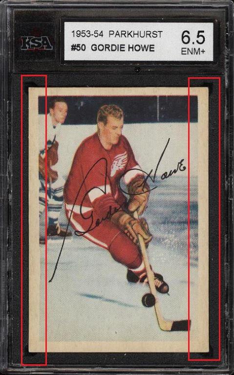 1953 Parkhurst Gordie Howe #50 Value gain of TBD This card was sold by PWCC to whitman111 (Gary Moser) as a KSA-6.5 on February 23, 2016 for an unknown amount. PWCC Marketplace link: https://www.pwccmarketplace.com/items/1214907 Same card was sold by PWCC as a PSA-8.5 for $8,600.00 on September 26, 2016. PWCC Marketplace link: https://www.pwccmarketplace.com/items/1355313 PWCC note from the PSA-8.5 listing description: "The offered '8.5' is beautifully centered with fantastic white borders and sharp corners. Perhaps what's most impressive about this card are the surfaces, boasting exceptional color and print. An all around stunner which ranks among the best copies we've brokered in our tenure." Yellow circles are fiber or print mark identifiers. Red squares identify areas of obvious trimming. Card has also been cleaned as the white borders are much brighter. ![]() ![]() ![]()