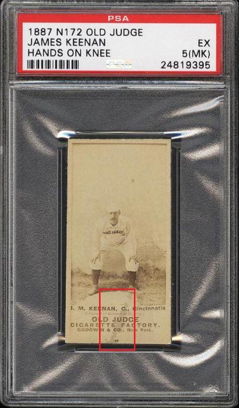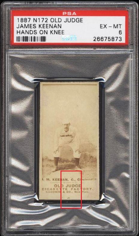1887 N172 Old Judge James Keenan HANDS ON KNEE Value gain of $557.50 This card was sold by PWCC to whitman111 (Gary Moser) as a PSA-5(MK) on December 06, 2015 for $202.50. PWCC Marketplace link: https://www.pwccmarketplace.com/items/1192624 Same card was sold by PWCC as a PSA-6 for $760.00 on March 12, 2017. PWCC Marketplace link: https://www.pwccmarketplace.com/items/1435724 Yellow circles are fiber or print mark identifiers. Red squares identify areas of stain and ink pen writing removal. ![]() ![]() ![]()