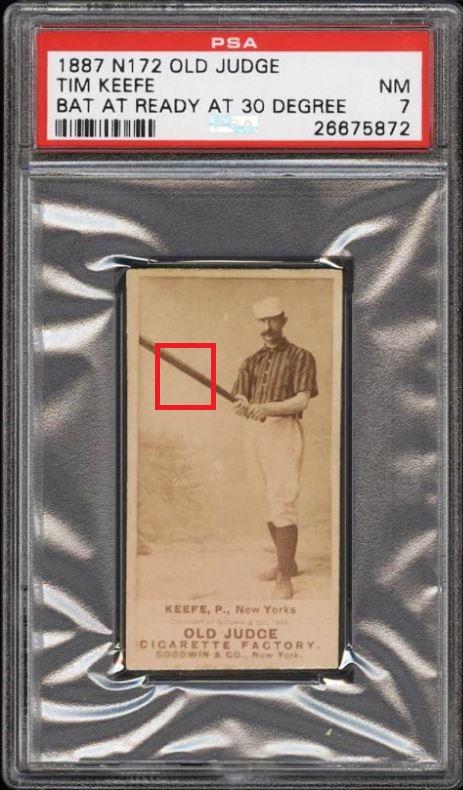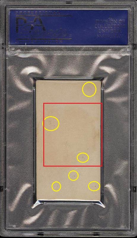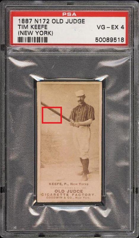 1887 N172 Old Judge Timothy Keefe BAT AT READY AT 30 DEGREE Value gain of $5,360.18 This card was sold by PWCC to whitman111 (Gary Moser) as a PSA-4 on September 06, 2016 for $1,240.87. PWCC Marketplace link: https://www.pwccmarketplace.com/items/1339715 Same card was sold by PWCC as a PSA-7 for $6,601.05 on March 12, 2017. PWCC Marketplace link: https://www.pwccmarketplace.com/items/1435723 PWCC mush from the PSA-7 listing description: "An astronomical rookie era production of this highly notable pre-war HOFer. The single finest example in the hobby and freshly graded by PSA, showing many attributes of an even higher grade. Dead centered with pack fresh surfaces and clean edges abound. This is a museum caliber card, worthy of the finest pre-war collection." Yellow circles are fiber or print mark identifiers. Red squares identify areas of large stain removal. ![]() ![]() ![]()