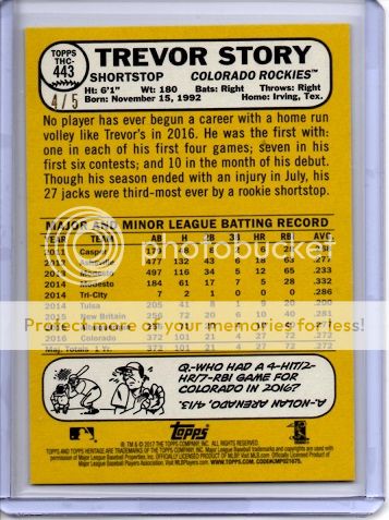 1 x 1989 Upper Deck High Series 1 x 2017 Topps Jumbo (2 Bonus Packs) 3 x 2017 Topps Heritage 1989 Upper Deck I was not expecting too much out of this one. I have opened the high series before and only pulled Craig Biggio and Randy Johnson. Too bad these guys did not have HOF careers. ![]() I did manage to pull a total of 1 - Randy Johnson, 1 - John Smoltz and 1 - Omar Vizquel. ![]() I also managed to pull the following: ![]() Both of them were the last card in the pack and both of them are missing the top of the hologram on the back, but it was great to pull both of them. 2017 Topps Jumbo Hits and best of the Bonus Packs. Jose Altuve All-star Game Medallion J.D. Martinez Jersey (This card is thicker than the medallion) Aaron Sanchez black 45/66 Andrew Benintendi Bonus ![]() and the best card from the box Salute Legends Ozzie Smith Autograph. ![]() 2017 Topps Heritage I opened three boxes and I was able to complete the base set and pulled 24 short prints. Here is the damage: Adam Wainwright Clubhouse Collection Nolan Arenado Clubhouse Collection Miguel Cabrera Clubhouse Collection Jose Altuve Chrome Refractor /569 Jacob DeGrom Chrome /999 Trevor Story Chrome /999 Aroldis Chapman Chrome /999 ![]() Robinson Cano Action Mike Trout Action Kris Bryant Action Detroit Tigers Flip Stock ![]() I did not realize what this next card was until I looked at the serial numbering. The front of the card looks like a regular chrome refractor to me, but it is the gold variety. Trevor Story 4/5 ![]()