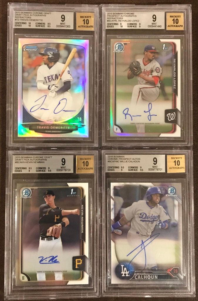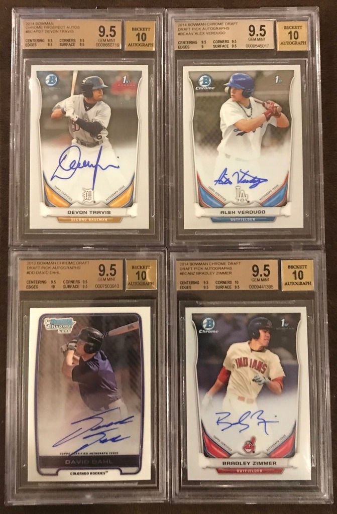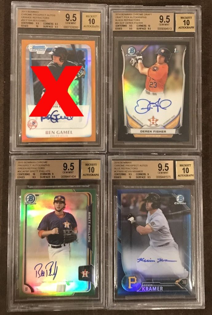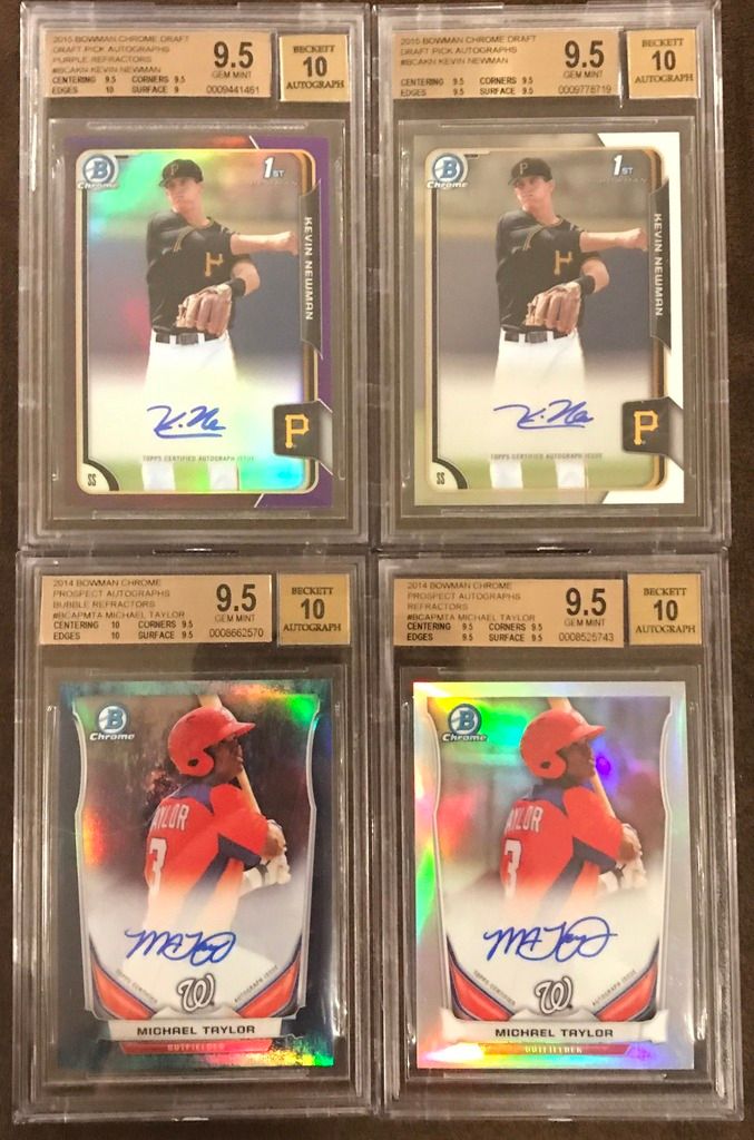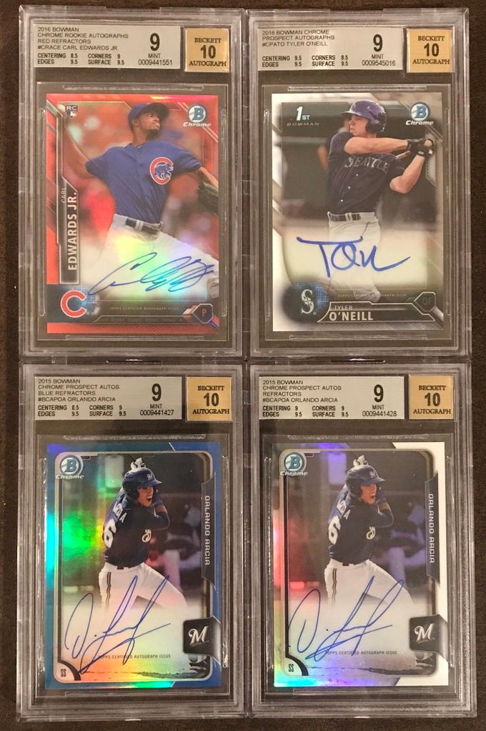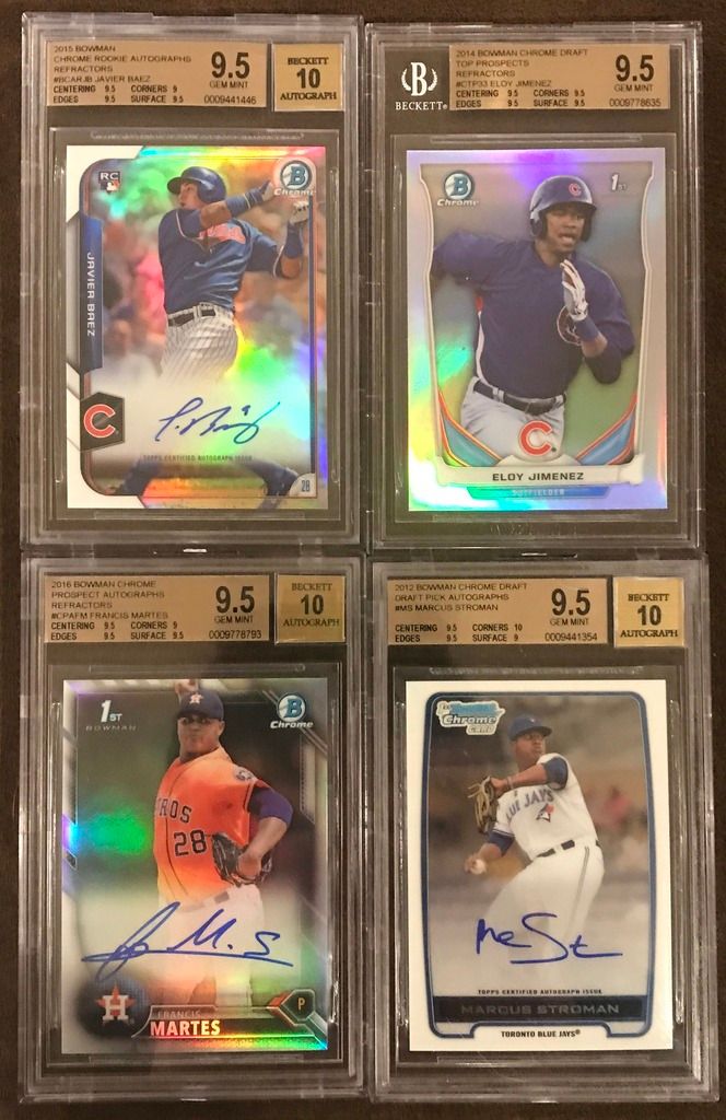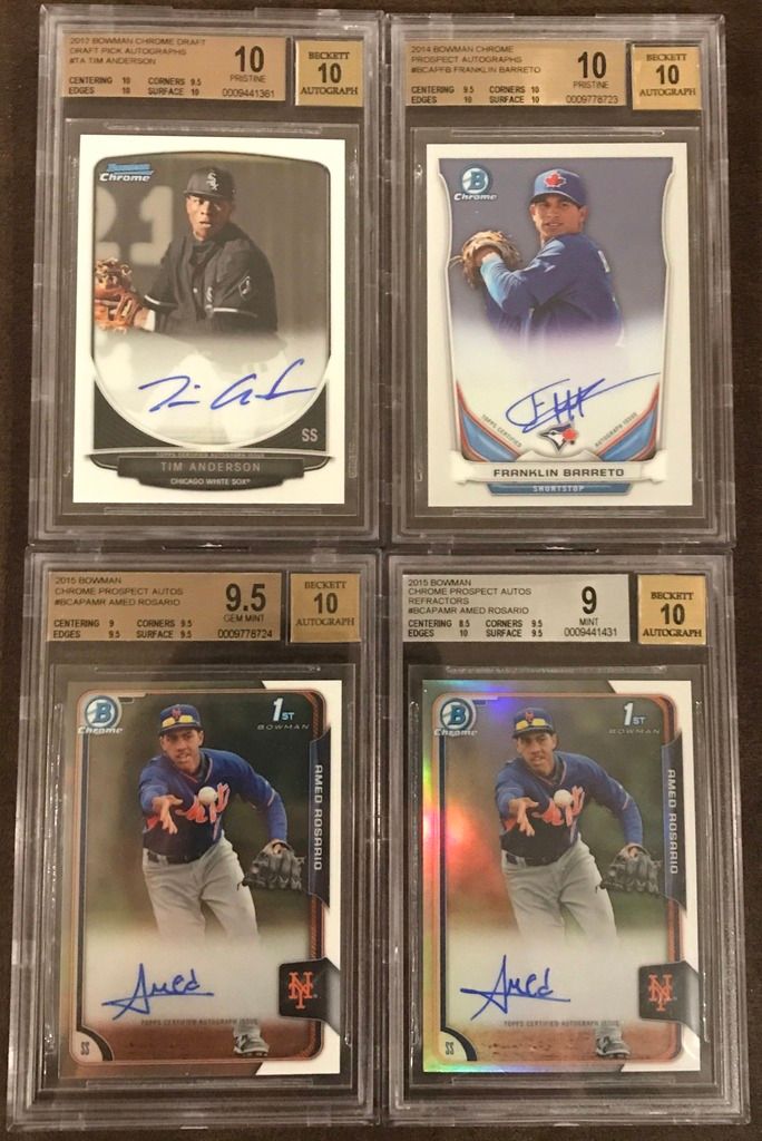 ![]() Tim Anderson BGS 10 PRISTINE Base Auto (POP 4) - $175 Franklin Barreto BGS 10 PRISTINE Base Auto (POP 3) - $230 Amed Rosario BGS 9.5 Base Auto - $270 Amed Rosario BGS 9 Refractor Auto #395/499 - $220 ![]() Ben Gamel BGS 9.5 Orange Refractor Auto #08/25 - SOLD Derek Fisher BGS 9.5 Black Refractor Auto #05/35 - $450 Brett Phillips BGS 9.5 Green Refractor Auto #54/99 - $120 Kevin Kramer BGS 9.5 Blue Refractor Auto #123/150 - $85 ![]() Kevin Newman BGS 9.5 Purple Refractor Auto #88/250 - $100 Kevin Newman BGS 9.5 Base Auto - $50 Michael Taylor BGS 9.5 Bubbles Refractor Auto #35/99 - $80 Michael Taylor BGS 9.5 Refractor Auto #326/500 - $40 ![]() Javier Baez BGS 9.5 RC Refractor Auto #400/499 - $70 Eloy Jimenez BGS 9.5 Refractor Non Auto - $35 Francis Martes BGS 9.5 Refractor Auto #413/499 - $60 Marcus Stroman BGS 9.5 Base Auto - $50 ![]() Devon Travis BGS 9.5 Base Auto - $30 Alex Verdugo BGS 9.5 Base Auto - $150 David Dahl BGS 9.5 Base Auto - $120 Bradley Zimmer BGS 9.5 Base Auto - SOLD ![]() Carl Edwards Jr. BGS 9 RC Red Refractor Auto #2/5 - $120 Tyler O'Neill BGS 9 Base Auto - $35 Orlando Arcia BGS 9 Blue Refractor Auto #104/150 - $80 Orlando Arcia BGS 9 Refractor Auto #462/499 - $30 ![]() Travis Demeritte BGS 9 Refractor Auto - $25 Reynaldo Lopez BGS 9 Refractor Auto - $22 Kevin Newman BGS 9 Base Auto - $25 Willie Calhoun BGS 9 Base Auto - $40 Last edited by bdsparty32; 07-09-2017 at 02:47 PM. |