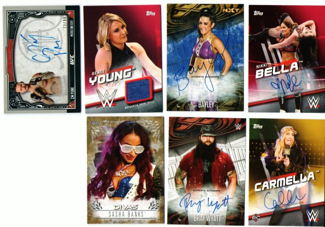 All 1/1's Bayley $175 Carmella $125 Mickie James $40 ![]() Carmella NXT Kiss Auto $80 Carmella NXT Kiss $30 Carmella Kiss Auto $50 Carmella Kiss Auto $50 Carmella Kiss $30 Carmella Kiss $30 ![]() AJ FCW Rookie $30 AJ Lee Rookie Auto $SOLD Mickie James Heritage II $SOLD Mickie James Heritage Chrome $35 Mickie James Heritage IV $25 Mickie James Mat Auto $35 ![]() Carmella /10 $40 Sasha /10 $15 Bayley /50 $25 Young /25 $10 Nikki /25 $22 Bray /200 $15 Punk /99 $SOLD