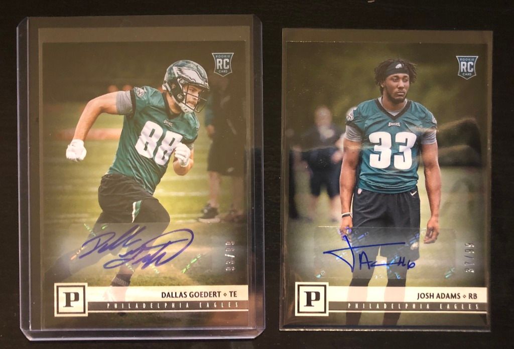 Leonard Fournette #05/50 Malik Jefferson RC #01/20 (pulled this in the same box as the 1/1 below and I remember thinking man.. first of the print run, I seem to pull so many of these, why couldn't I have just got the 1/1 instead!? And then ironically a 1/1 pops out a few cards later) Jordan Whitehead RC #33/50 Xavier Rhodes #16/50 Clay Matthews #32/50 Rashaan Evans RC #28/50 Paul Krause Franchise Leaders #16/20 Rookies (did not do very well on my RC pulls): Korey Robertson Derwin James Kurt Benkert Quadree Henderson Connor Williams Arden Key Justin Reid Bo Scarbrough Minkah Fitzpatrick Luke Falk Equanimeous St. Brown DJ Chark Autos: A couple Eagles... $15 dlvd for both ![]() And then my first retail 1/1 hit!! Kinda wish it was a more notable player, but still cool... $23 dlvd ![]() Pretty fun break overall. One pack, 20 cards. 3 serial #'d cards plus the auto makes it feel more like a hobby break. And $30/box is not too bad either (same price as premium Elite blasters). Thanks for looking! |