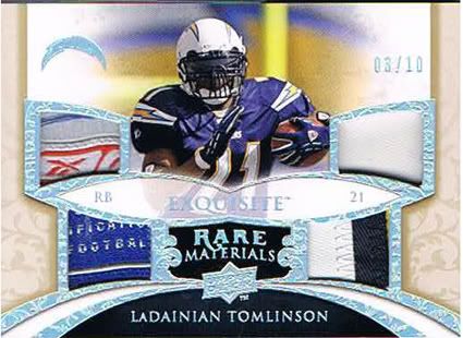 Tim Hightower silk #5/5 (Mayo) Fred Jackson xFractor #170/399 (Finest and following) Damian Williams RC xfractor #/399 Vincent Jackson xfractor #/399 Tony Gonzalez black refractor #/99 Knowshon Moreno black refractor #/99 Toby Gerhart RC atomic refractor Jordan Shipley RC atomic refractor Dexter McCluster RC atomic refractor Jerry Hughes RC gold #/25 (sterling) Chester Taylor #4/10 (Prestige) Kristi Yamaguchi #/99 (Heroes) Clinton Portis #/30 (Portraits) Steve Smith #1/75 (Portraits) Rashard Mendenhall #/80 (Exquisite) DeAngelo Williams #/80 (Exquisite) Santana Moss #/75 (Exquisite) Marcus Easley RC blue #/199 (Prime) Riley Cooper RC #/999 (Prime) Ronnie Brown RC gold #/75 (Portraits) JJ Arrington #/425 (Portraits) Parris Warren RC #/425 (Portraits) Vernand Morency RC #/425 (Portraits) Vincent Jackson “Futures” #/25 (Reflections) Vincent Fuller “Futures” #/499 (Reflections) Patches/JSY: Dan LeFevour RC gold 2-color patch #/25 (Sterling) CJ Spiller RC gold 3-color patch #/25 (Sterling) Josh Cribbs 2-color patch (with dirt/mud/blood?) #/50 (Elite) Wes Welker 4-color patch #/50 (Elite) Josh Freeman 3-color patch #/50 (Threads) Deion Branch 3-color patch #/50 (Threads) Brandon Pettigrew 3-color patch/ball #/50 (Gridiron) Mike Sims-Walker 3-color patch #/50 (Gridiron) Daniel Graham 4-color patch (8-breaks) #/650 (Rookies & Stars) Dexter Jackson/Jerome Simpson dual 3-color patches #/35 (Rookie Threads) Greg Jennings/Ryan Grant 3-color/2-color JSY #1/25 (Absolute) Steve Smith/Julius Peppers/Jon Beason 2-color/2-color/2-color patches #/25 (Limited) Montario Hardesty RC JSY #/420 (Prime) Carson Palmer JSY (Portraits) Michael Vick JSY (Portraits) Alex Smith RC JSY (Portraits) Drew Bledsoe JSY (Reflections) Barry Sanders/Troy Aikman DUAL JSY (Reflections) Autos: Adrian Arrington RC #/99 (National Treasures) Marcus Easley RC blue refractor #/599 (Platinum) Patrick Robinson RC Aspirations #/49 (Elite) Golden Tate RC 2-color (small patch) #/100 (Finest) John Mackey inscribed (HOF 92) #/100 (Classics) Colt McCoy RPM #/399 (Absolute) Vernand Morency RC 8x10 auto (Portraits) Shawn Merriman RC auto (Reflections) Let me know if you see something you like.