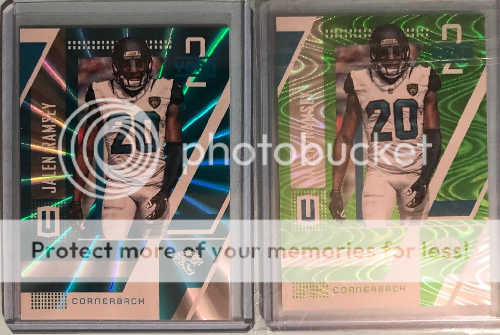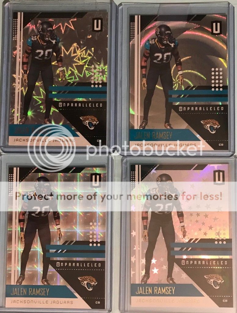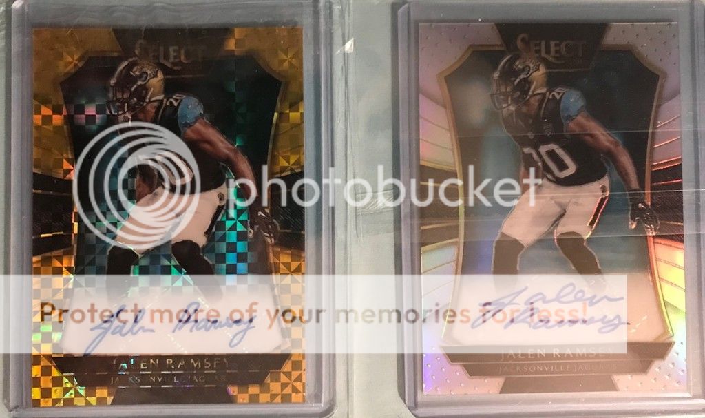 Trying to hunt down the 2018 Panini Select rainbows of Jalen Ramsey for the Concourse, Die-Cuts, Sensations, and Phenomenons. Here’s what I have and listed above each pic is what I need. Thanks! If you can get me in touch with any of the (3) 1/1’s I don’t have, I’ll shoot you a finder’s fee! Pics for taking the time to read, thanks!! Concourse - NEED: Black 1/1, Orange /49 ![]() Die-Cut Premier Level - NEED: Zebra SSP, Gold /10, Neon Green /49 ![]() Sensations - NEED : Base Prizm, Black 1/1 ![]() Phenomenon - NEED: Gold /10, Black 1/1