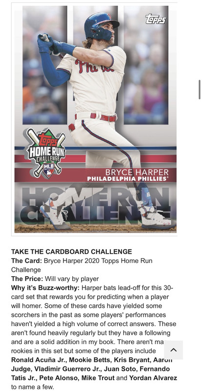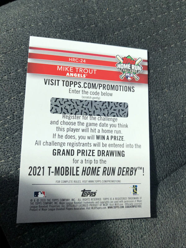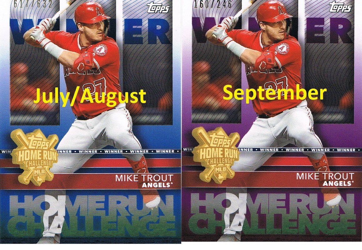 2018 Home Run Challenge Thread https://www.blowoutforums.com/showthread.php?t=1199779 2019 Home Run Challenge Thread https://www.blowoutforums.com/showthread.php?t=1271551 2020 Complete Contest Results ![]() Rules of Note: __________________________________ * The prize for picking the correct date of a HR is a month specific parallel card. * There are 2 possible parallels ( July/August & September) * You have until 9am EST the day of the game to enter the code online * Once a date is picked, Topps will not allow you to change this * If the player does not play that day for any reason (cancelled game or because they sit out) the play is considered a loss. * You only win one parallel card no matter how many home runs that player hits that day. **2020 Topps Home Run Challenge Rules are posted in the link below** https://www.topps.com/media/pdf/HRch...0-%20FINAL.pdf UPDATED RULES FOR THE SHORTENED SEASON https://www.topps.com/media/pdf/HRch...0-%20COVID.pdf A *NEW* UPDATED RULES FOR THE SHORTENED SEASON https://www.topps.com/media/pdf/HRch...DUpdate723.pdf HERE ARE EXAMPLES OF WINNER CARDS FROM PRIOR YEARS 2018 EXAMPLES ![]() 2019 EXAMPLES ![]() 2020 EXAMPLES ![]() _________________________________________________________________________ The 2020 HR Challenge Checklist HRC-1 Bryce Harper Philadelphia Phillies® HRC-2 Ronald Acuña Jr. Atlanta Braves™ HRC-3 J.D. Martinez Boston Red Sox® HRC-4 Freddie Freeman Atlanta Braves™ HRC-5 Mookie Betts Boston Red Sox® HRC-6 Nolan Arenado Colorado Rockies™ HRC-7 Javier Baez Chicago Cubs® HRC-8 Kris Bryant Chicago Cubs® HRC-9 Anthony Rizzo Chicago Cubs® HRC-10 Francisco Lindor Cleveland Indians® HRC-11 Aaron Judge New York Yankees® HRC-12 Giancarlo Stanton New York Yankees® HRC-13 Vladimir Guerrero Jr. Toronto Blue Jays® HRC-14 George Springer Houston Astros® HRC-15 Juan Soto Washington Nationals® HRC-16 Joey Gallo Texas Rangers® HRC-17 Paul Goldschmidt St. Louis Cardinals® HRC-18 Manny Machado San Diego Padres™ HRC-19 Fernando Tatis Jr. San Diego Padres™ HRC-20 Josh Bell Pittsburgh Pirates® HRC-21 Pete Alonso New York Mets® HRC-22 Gleyber Torres New York Yankees® HRC-23 Christian Yelich Milwaukee Brewers™ HRC-24 Mike Trout Angels® HRC-25 Cody Bellinger Los Angeles Dodgers® HRC-26 Alex Bregman Houston Astros® HRC-27 Yordan Alvarez Houston Astros® HRC-28 Max Kepler Minnesota Twins® HRC-29 Max Muncy Los Angeles Dodgers® HRC-30 Rhys Hoskins Philadelphia Phillies®