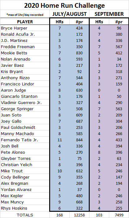 HRC-1 Bryce Harper Philadelphia Phillies® 35HR HRC-2 Ronald Acuña Jr. Atlanta Braves™ 41HR HRC-3 J.D. Martinez Boston Red Sox® 36HR HRC-4 Freddie Freeman Atlanta Braves™ 38HR HRC-5 Mookie Betts Boston Red Sox® 29HR HRC-6 Nolan Arenado Colorado Rockies™ 41HR HRC-7 Javier Baez Chicago Cubs® 29HR HRC-8 Kris Bryant Chicago Cubs® 31HR HRC-9 Anthony Rizzo Chicago Cubs® 27HR HRC-10 Francisco Lindor Cleveland Indians® 32HR HRC-11 Aaron Judge New York Yankees® 27HR HRC-12 Giancarlo Stanton New York Yankees® 3HR HRC-13 Vladimir Guerrero Jr. Toronto Blue Jays® 15HR HRC-14 George Springer Houston Astros® 39HR HRC-15 Juan Soto Washington Nationals® 34HR HRC-16 Joey Gallo Texas Rangers® 22HR HRC-17 Paul Goldschmidt St. Louis Cardinals® 34HR HRC-18 Manny Machado San Diego Padres™ 32HR HRC-19 Fernando Tatis Jr. San Diego Padres™ 22HR HRC-20 Josh Bell Pittsburgh Pirates® 37HR HRC-21 Pete Alonso New York Mets® 53HR HRC-22 Gleyber Torres New York Yankees® 38HR HRC-23 Christian Yelich Milwaukee Brewers™ 44HR HRC-24 Mike Trout Angels® 45HR HRC-25 Cody Bellinger Los Angeles Dodgers® 47HR HRC-26 Alex Bregman Houston Astros® 41HR HRC-27 Yordan Alvarez Houston Astros® 27HR HRC-28 Max Kepler Minnesota Twins® 36HR HRC-29 Max Muncy Los Angeles Dodgers® 35HR HRC-30 Rhys Hoskins Philadelphia Phillies® 29HR I was really looking forward to the HR Challenge this year. Afterall, the Twins set the MLB HR record with 5 players recording 30+ HRs in 2019. So I'll lodge my "homer" complaints with Topps here: how do only have 1 Twins player and yet 3 Cubs players, two of which didn't even clear 30HRs? Further, how do you have 3 Cubs players and leave out Schwarber? How does Eugenio Suárez not make the cut? I don't understand Topps logic for this checklist.