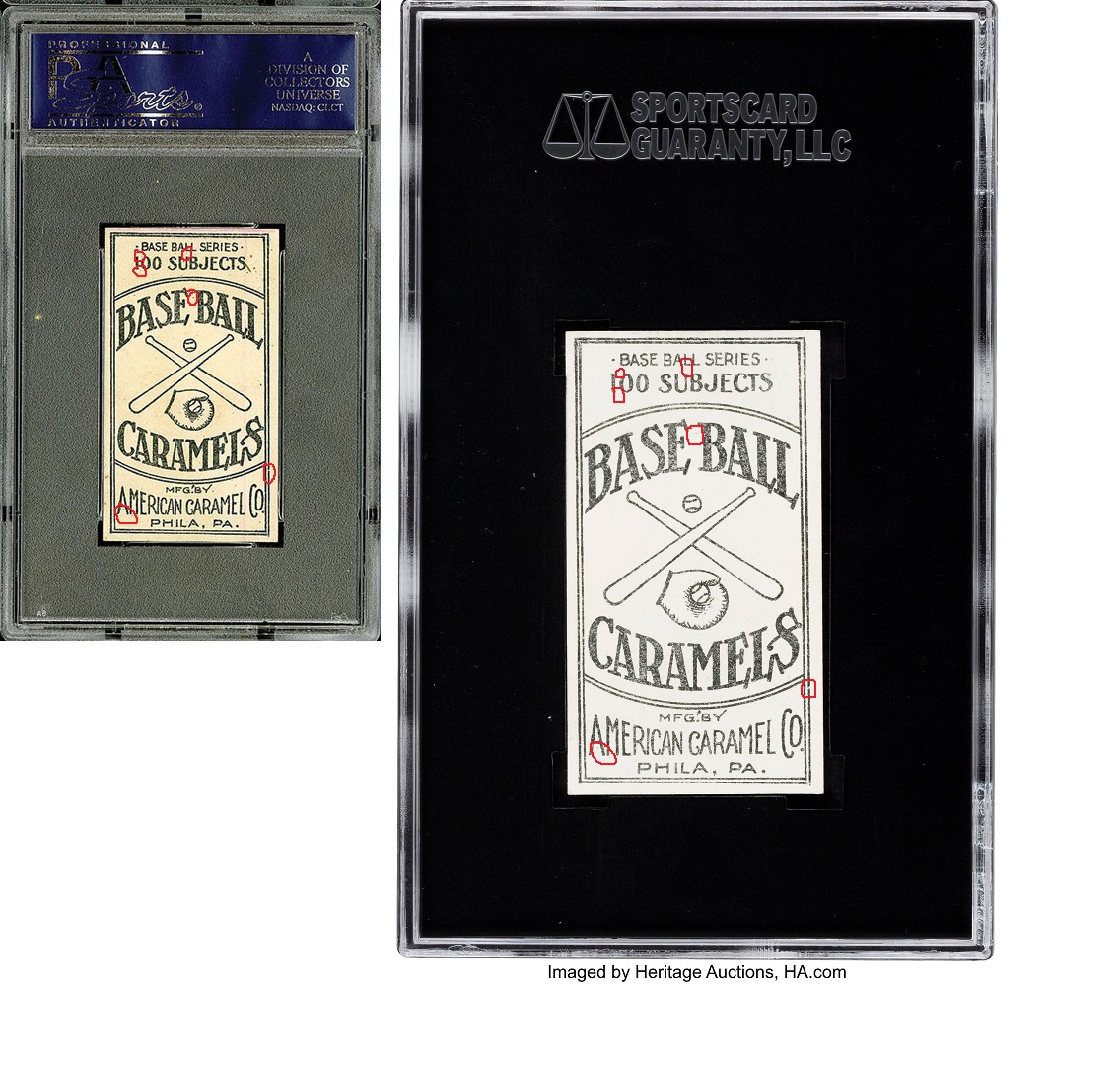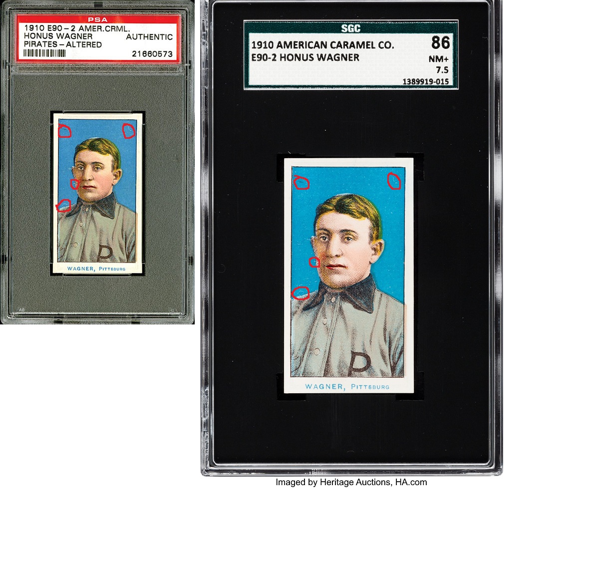 I found a E90-2 American Caramel Honus Wagner which used be be a PSA Authentic Altered. It was sold for $5,333 in Spring 2014 at Robert Edwards Auctions. It was then chemically washed as you can see in the photos below. Heritage Auctions sold it as a SGC 7.5 (SGC 86) in August 2018 for $72,000!! Those chemicals really cleaned it up and made matching print marks on the back difficult. Although they were bleached you can still see them! I am certain this is a match. I will continue to help the cause when I can! I know the BODA and Pip are the board's experts on bleaching but look at the damage to the black lettering on the back of the Wagner. The ink is much much lighter than on the PSA Authentic Altered which I believe is a by-product of the whitener chemicals. VALUE GAIN of $66,667 LINK 1 LINK 2 LINK 3 ![]()
