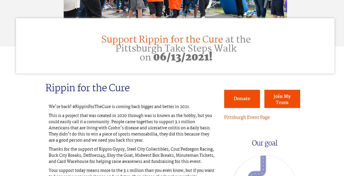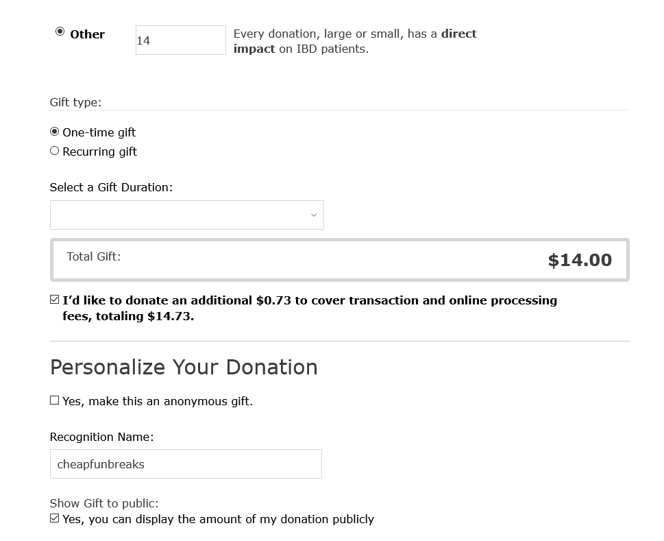 1 Got to Link https://online.crohnscolitisfoundati...eam&fr_id=9940 2 Click donate 3 Pay 4 Done! .... 5 Screenshot your receipt (either the page or email) 6 Submit donation for the Mega Break (I will get you a link). Current website price for the case is $2950 - so please let's raise $6k ok?