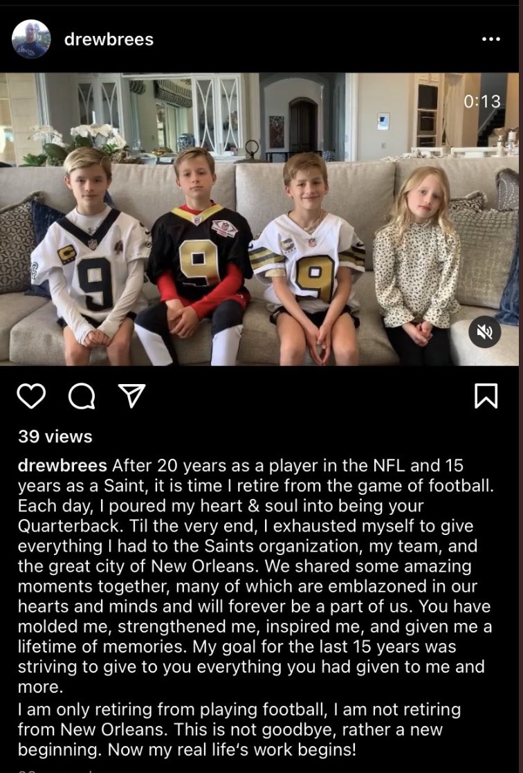 Going to miss him as a Saints fan and season ticket holder. We have been absolutely spoiled at QB since ‘06. Also excited to see where we go next. Winston, Hill, FA signing, trade....