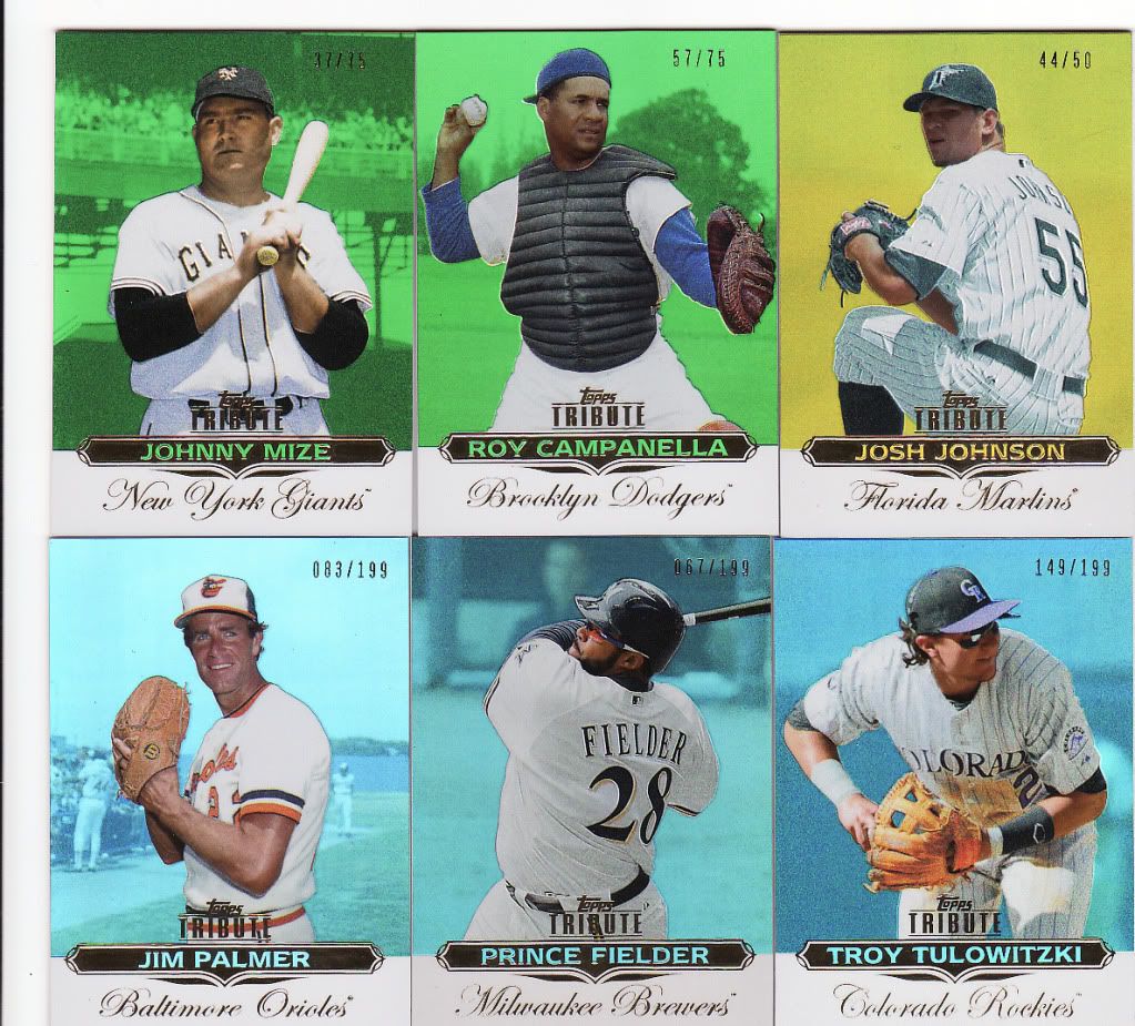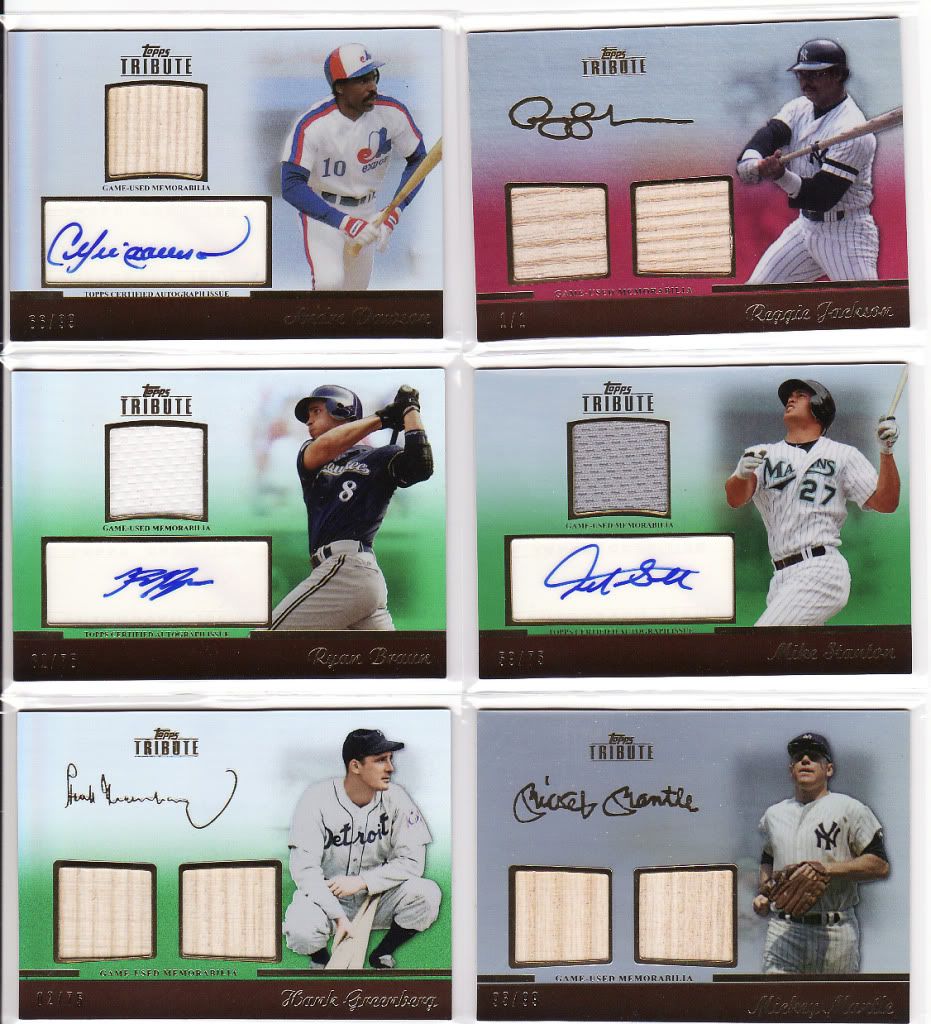 Refractors Troy Tulowitzki /199 Prince Fielder /199 Jim Palmer /199 Johnny Mize /75 Roy Campanella /75 Josh Johnson /50 ![]() Hits ![]() Reggie Jackson bat relic 1/1 Mickey Mantle bat relic /99 Hank Greenberg bat relic /75 Mike Stanton jersey auto /75 Andre Dawson jersey auto /99 Ryan Braun jersey auto /75 I think the bitter taste of my 2010 Porcello Tribute box is gone now ![]()