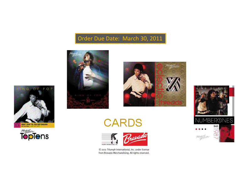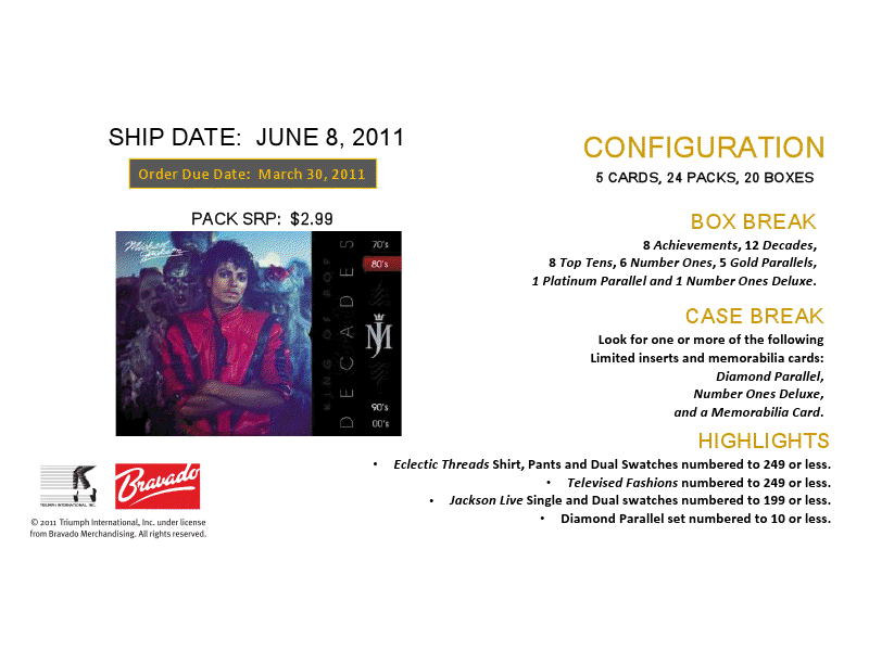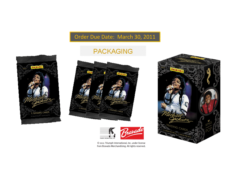 Please click the links below to purchase this product by the Box or Case CASE http://www.blowoutcards.com/index.ph...oducts_id=4410 BOX http://www.blowoutcards.com/index.ph...oducts_id=4411 2011 Panini Michael Jackson Trading Cards Configuration: 20 boxes per case. 24 packs per box. 5 cards per pack. MICHAEL JACKSON T/C BOX BREAK - 8 Achievements - 12 Decades - 8 Top Tens - 6 Number Ones - 5 Gold Parallels - 1 Platinum Parallel - 1 Number Ones Deluxe CASE BREAK Look for one or more of the following Limited inserts and memorabilia cards: - Diamond Parallel - Number Ones Deluxe - and a Memorabilia Card HIGHLIGHTS - Eclectic Threads Shirt, Pants and Dual Swatches numbered to 249 or less. - Televised Fashions numbered to 249 or less. - Jackson Live Single and Dual swatches numbered to 199 or less. - Diamond Parallel set numbered to 10 or less. ![]() ![]() ![]() Last edited by blowoutcards2; 04-26-2011 at 11:22 AM. |