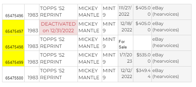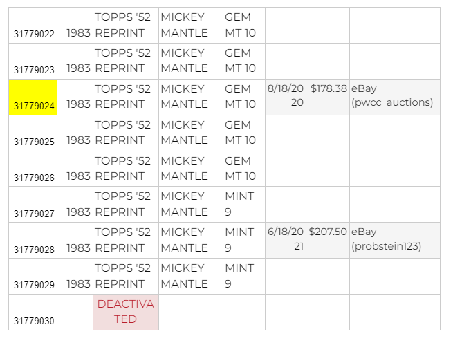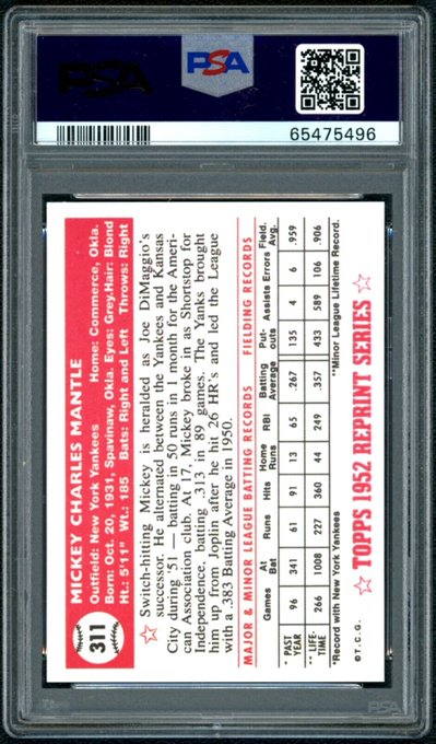 The 1983 Topps '52 reprint set contains one of the most desirable licensed reprints of Mickey Mantle's iconic 1952 Topps #311 card. Featuring card fronts with a slightly glossy finish and limited to an estimated 10,000 copies, they are rarely found in high grade due to centering problems and issues with stray print marks. Lately, however, I noticed a number of higher grade examples show up on eBay in PSA slabs. Many of these originate with seller hearvoices, who has in the past been accused of selling forgeries (see, for instance, HERE and HERE). This thread will demonstrate that the two high grade examples currently on eBay, a PSA 9 being sold by the aforementioned hearvoices, and a PSA 10 being sold by nathan2750, are counterfeit cards. Below are counterfeit examples that I uncovered, all in PSA holders. It is unclear where these counterfeit reprints originated, but they are assuredly not authentic examples of the Mick's 1983 Topps '52 Reprint: ![]() PSA Cert #65475498 (currently on eBay) ![]() PSA Cert #69547866 (currently on eBay) ![]() PSA Cert #31779024 ![]() PSA Cert #40581001 ![]() PSA Cert #65475497 ![]() PSA Cert #65475499 And now for some authentic examples. First, there is a PSA 7 graded example on eBay that is being sold with the complete set. It is authentic. ![]() ![]() ![]() ![]() ![]() And finally, here is a comparison of an authentic card back with a counterfeit card back, along with three easy steps to spot a fake. The quickest tell is that counterfeits have the number 311 in the lower left corner whereas authentic cards feature it in the upper right: ![]() There are currently 14 PSA 10 examples of this card in the Pop Report. I question whether any of them are authentic. Based on this report, PSA has some decertifying to do.