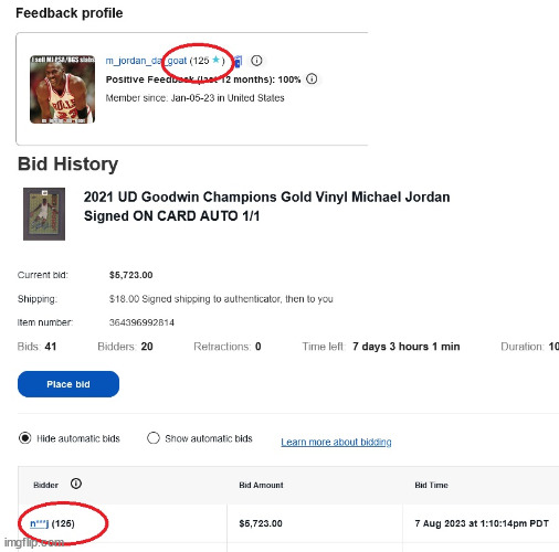 OP just bought another Jordan superfractor from this set at the National so he is trying to pump the value on this one by making multiple threads. In addition, he is bidding the card up—not to shill it per se, but to try to inflate the value of his card. I’m sure he would pay if he won this one, however as evidenced by all the spam/pump threads, winning this card is not his goal.