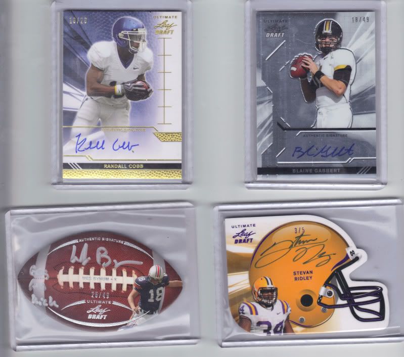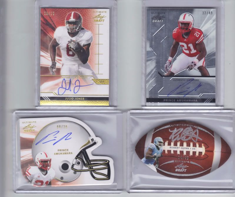 Everything will be on ebay for three days starting tomorrow and ending Sunday. I will take offers here up until tomorrow evening. PM if interested. Box 1 Prince Amukamara /49 Julio Jones gold /20 Robert Quinn football die-cut /49 Prince Amukamara helmet die-cut gold /20 Box 2 Dion Lewis /49 Ricky Stanzi /49 DeMarco Murray football die-cut /49 Graig Cooper helmet die-cut gold 01/20 Box 3 Delone Carter blue /20 Shane Vereen /49 Tandon Doss football die-cut /49 Christian Ponder helmet die-cut gold /20 Box 4 Blaine Gabbert /49 Randall Cobb gold /20 Wes Bynum football die-cut inscription "BCS GW Kick" /49 Steven Ridley helmet die-cut purple(?) /5 ![]() ![]() ![]()