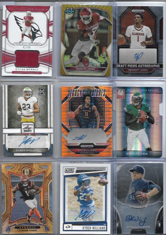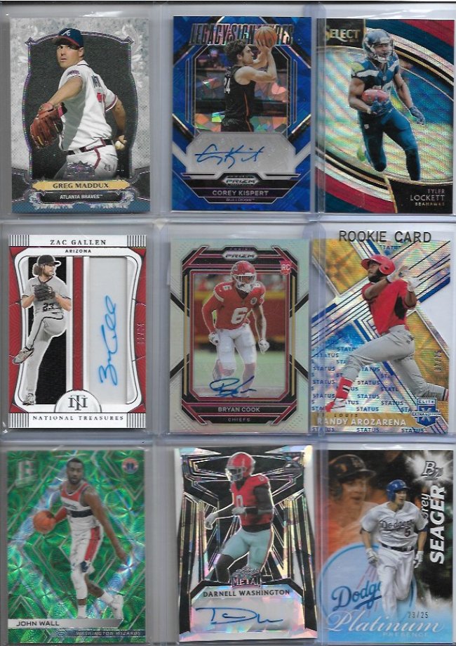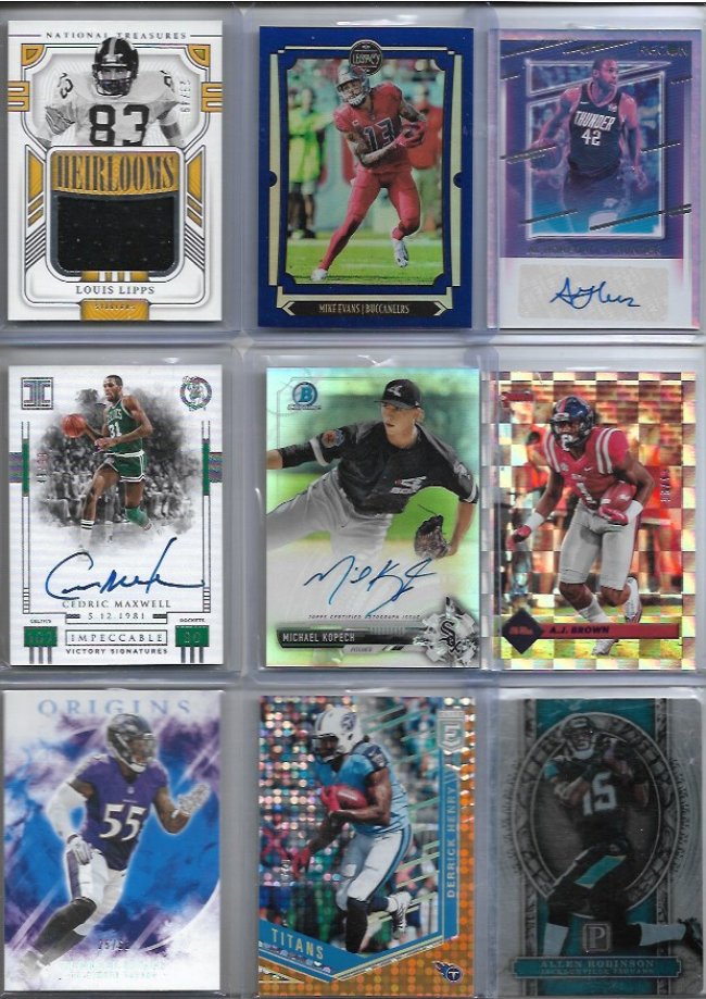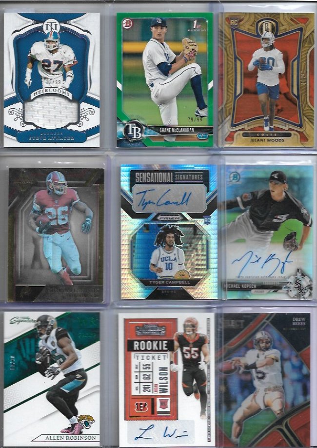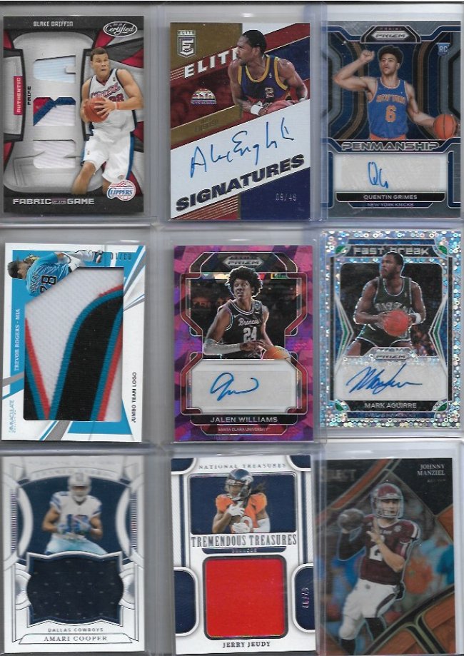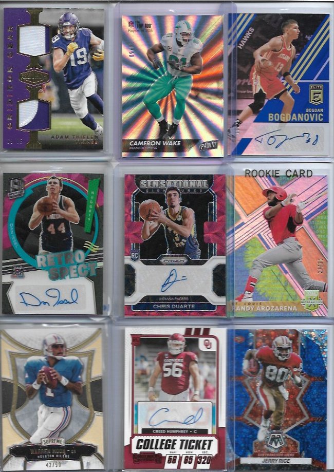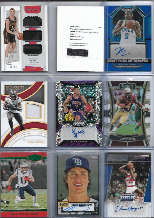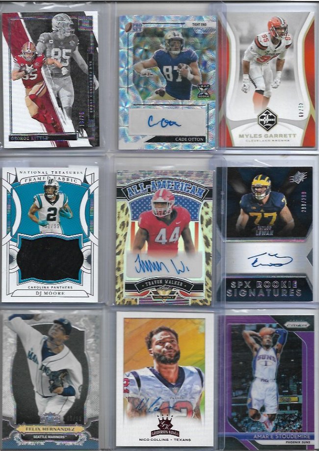 looking to sell this lot Asking $700 dlvd or Best offer As always I'm open to offers!! ![]() Blake Griffin /25 Alex English /49 Quentin Grimes RC Trevor Rogers logo /10 Jalen Williams /99 Mark Aguirre fast break Amari Cooper /99 Jerry Jeudy /49 Johnny Manziel /49 ![]() Brandon Stephens RC /35 Steve Smith /49 Cade Otton RC /20 Alec Pierce RC /6 Tre'davious White Clinton Portis /75 Demaryius Thomas /50 Brandon Marshall RC /100 Peyton Manning /49 ![]() Hank Blalock /224 Joe Haden Rc /50 Bo Bichette /99 Desean Jackson RC Rob Gronkowski /25 Nelson Agholor RPA GOLD /10 Larry Johnson /99 Malik Willis Dual RC /249 ![]() Kevin Huerter RC /99 Oneyeka Okongwu /99 Kevon Looney /125 Chris Godwin /99 Kevin Johnson fast break Dalvin Cook /35 julian Edelman green /20 Tyler Glasnow Elvin Hayes /59 ![]() Kyler Murray /99 Marvin Mims RC GOLD /50 Herbert Jones Kyren Williams RC Ayo Dosunmu Orange /49 Michael Vick /93 Ja'marr Chase /75 Kyren Williams RC Devin Williams RC ![]() Greg Maddux /50 Corey Kispert /75 Tyler Lockett /99 Zac Gallen /64 Bryan Cook RC Silver Randy Areozarena RC /75 John Wall /49 Darnell Washington RC 4/4 Corey Seager /25 ![]() Steve Atwater /99 Shane McClanaHan RC /99 Jelani Woods Fotl /30 Adrain Peterson GOLD /50 Tyger Campbell michael Kopech RC /499 Allen Robinson Green 1/10 Logan Wilson RC Drew Brees /49 ![]() George Kittle /75 Cade Otton RC /20 Myles Garrett 49/49 DJ Moore /99 Trayvon Walker RC Leopard print /5 Taylor Lewan RC /299 Felix Hernandez /50 Nico Collins Rookie /75 Amar'E Stoudemire Purple /75 ![]() Adam Thielen dual /85 Cameron Wake wild card /50 Bogdan Bogdanovic /25 Dan Issel /99 Chris Duarte RC Randy Arozarena RC /25 Warren Moon Gold /50 Creed Humphrey Rc RED Jerry Rice 75/75 ![]() Louis Lipps /49 Mike Evan refractor /50 Al Horford Cedric Maxwell /99 Michael Kopech /499 aj Brown /49 Terrell Suggs /60 Derrick Henry /49 Allen Robinson /50