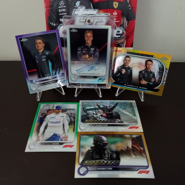 ![]() Nov 24 and 25: AEW Wrestling Nov 26 and 30: 2022 Topps Chrome F1 Hobby Lite Nov 27: WWE Fully Loaded + Undisputed Nov 28: Marvel Beginnings Nov 29: AEW Spectrum Dec 1: 2022-23 NBA Hoops Dec 2: 2023 WNBA Prizm Dec 3: Archives Snapshots + Chronicles Mega Box Dec 4: 2022-23 SPx ![]() After breaking open 2 Hobby Lite boxes, I opened my 1 regular hobby box. I did hit an auto, but it was current reserve driver Liam Lawson. He's still really young, so maybe he'll still break out at some point. ![]() Other numbered refractors: Williams Racing Latifi/Albon Constructor Coalition Insert Gold 34/50 Esteban Ocon Green 43/99 Lewis Hamilton GP Winner Mini Diamonds 96/299 Logan Sargeant FS Purple 177/399 Lewis Hamilton GP Winner Gold/Purple Marcus Armstrong Checker Flag X-Fractor