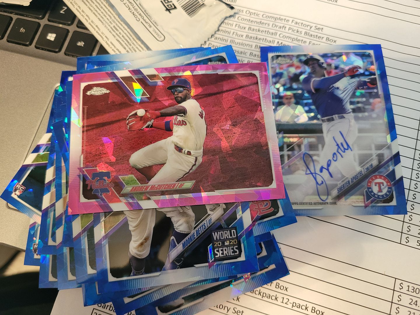 Sitting at home multi-tasking trying to inventory and sell my sealed stuff as budgets are getting tight. Noticed how low these 2021 Topps Chrome Sapphire Boxes have gotten so I decided I was just going to rip one of the 3 I had on my shelves to maybe catch a break. Got my RC auto Sherten Apostel meh and then of course I havent seen a single parallel till I get to the last pack. Saw the color, checked the pack wrapper and it definitely wasnt purple.