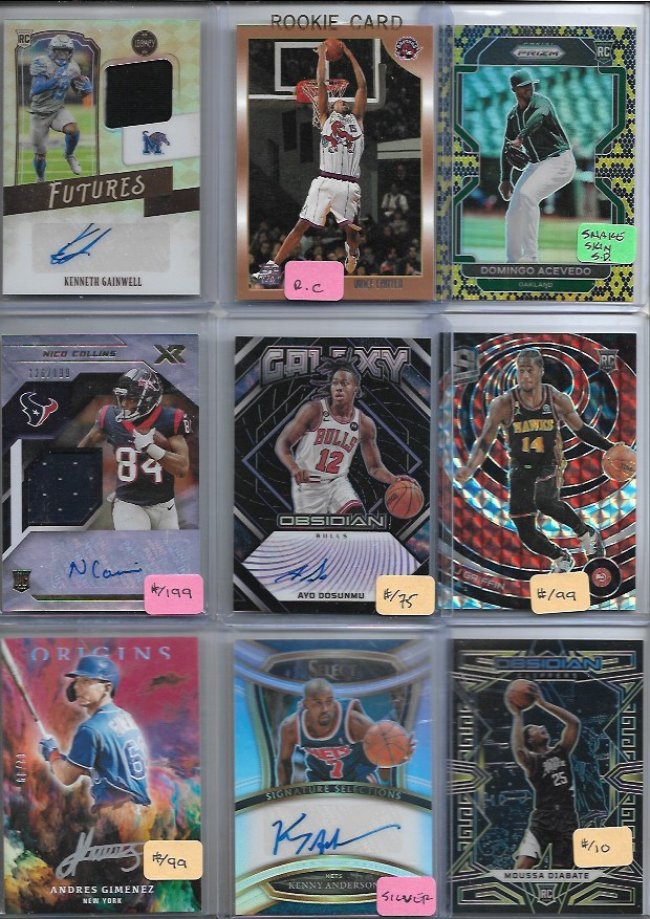 looking to sell the lot below ASKING 7.50 EA CARD DLVD 162 TOTAL CARDS 162X$7.50= $1215 ASKING PRICE OR BEST OFFER!! AS ALWAYS IM OPEN TO OFFERS!!! ![]() luis robert RC BGS 9.5 bol bol RC PSA 8 Zion Williamson RC PSA 10 Giannis SILVER PSA 9 ![]() Isaiah Stewart /25 Isaiah Mobley RC Zay Flowers RC /199 Joakim Noah / Mike Conley/ Rudy Fernandez Triple /100 Patrick Baldwin JR RC /49 Quentin Johnson RPA /149 Deni Avoija RC Jahan Dotson RPA /299 ![]() Kevin McHale game worn /99 Mike Conley /99 Bobby Dalbec RPA /199 Christian Kirk RPA Wan'Dale Robinson RC /50 Jalen Tolbert RPA /99 LeSean McCoy Alec Pierce RPA /249 ![]() Don Larsen on card Diontae Johnson RPA Jason Giambi game used on card /25 Gaylord Perry on card Tyler Allgeier RPA /199 Josh Reynolds RPA Goose Gossage on card (AUTOGRAPH IS NOT SMEARED BAD PHOTO ONLY) RHYS Hoskins game used /75 ![]() ELIJAH MOORE RPA /99 MARK WILLIAMS RC DALLAS GOEDERT /75 RHYS HOSKINS /149 JAYSON TATUM RC PAT FREIERMTH RC WENDALL CARTER JR RPA /99 TYLER GLASNOW /8 RICHARD HAMILTON ON CARD ![]() PATTY MILLS /49 HERBERT JONES /50 DENNIS ECKERSLEY GOLD /10 CURTIS SAMUEL RPA /75 LARS NOOTBAR VINCE CARTER ROOKIE AJ GRIFFIN RC /99 OBI TOPPIN SIAKAM PASCAL /99 ![]() MAURICE CHEEKS /25 ROLLIE FINGERS ON CARD JAYSON TATUM RC JOEY BART RPA /99 JORDAN POOLE /49 JA MORANT RC MASATAKA YOSHIDA GOLD RC GLOVE /10 CLOYD VICTOR BOYER ON CARD DYSON DANIELS RC /75 ![]() TREYLON BURKS RPA /99 CLIFFORD DAY CHAMBERS ON CARD RONALD ACUNA JR /99 CORBIN BURNS RC ON CARD CJ ABRAMS /25 IMMANUEL QUICKLEY RC /99 OCHAI AGBAJI RC /99 ARTIS GILMORE JOSE ALTUVE /100 ![]() KENNETH GAINWELL RPA /399 VINCE CARTER RC DOMINGO ACEVEDO RC SNAKESKIN /50 NICO COLLINS RPA /199 AYO DOSUNMU /75 AJ GRIFFIN RC /99 ANDRES GIMENES /99 KENNY ANDERSON MOUSSA DIABATE GOLD RC /10 ![]() RASHEE RICE RC /125 MARVIN BAGLEY /5 JALEN MCDANIELS RYAN ZIMMERMAN /25 JOE DE MAESTRI ON CARD DAMIEN LILLARD FAST BREAK JOSH GIDDEY RC MARCUS SMART /99 WENDALL MOORE JR RC /99 ![]() DJ CHARK RPA /249 JAYSON TATUM /99 DIRK NOWITZKI RC ANTONIO GIBSON RPA /299 DOUG FLUTIE /99 JADEN IVEY RC RED ICE MONTE MORRIS GOLD /10 JOEL EMDIID RC DONOVAN MITCHELL FAST BREAK ![]() DIONTAE JOHNSON GOLD STANDARD /75 JOHN COLLINS BOJAN BOGDANOVIC /99 VLAD GURRERO JR /25 MALCOLM BROGDAN DAMIAN LILLIARD FAST BREAK Zion WILLIAMSON RC JALEN DUREN RC RED ICE ANTHONY EDWARDS RC ![]() FAT LEVER /149 ZION WILLIAMSON /50 JEREMY SOCHAN RC SILVER CHUBA HUBBARD RPA /399 QUENTIN GRIMES RC ANTHONY EDWARDS RC JOSHUA KELLY RPA /199 CAM REDDISH /49 DWIGHT HOWARD RC ![]() DANIEL GAFFORD /149 PAUL PIERCE RC MIKE WILLIAMS /50 JAKE BURGER RC JALEN JOHNSON RC DRUW JONES RC 1ST ROLANDO BLACKMAN JALEN DUREN RC RUI RC ![]() CHARLES BARKLEY /50 STEPHEN CURRY /199 JARRETT ALLEN /50 DERRICK ROSE /99 JADEN HARDY RC /99 DRAKE LONDON /199 JORDAN CLARKSON /25 SHOHEI OHTANI /199 KRIS BRYANT /199 ![]() DONOVAN MITCHELL RC DIAMOND 9 TYLER HERRON RC PSA 9 KYLER MURRAY RC PSA 8 JUSTIN HERBERT RC HGA 9 ![]() KYLE KUZMA RC GMA 10 GRANT WILLIAMS RC PSA 9 /125 MICHAEL JORDAN BCCG 10 JIMMY GAROPPOLO RC PSA /10 ![]() LUIS CASTILLO LAMELO BALL RC COLLIN SEXTON RC SHOHEI OHTANI RC /199 DJ STEWART RC GOLD /50 ANDREW NEMBARD RC /199 VICTOR ACOSTA RC /75 JAKE LAMB RC GOLD /50 ELIJAH HUGHES RC /25 ![]() FEMI ODUKALE RC DAVANTE ADAMS GOLD /10 MARJON BEAUCHAMP RC DEMARR LANGFORD RC ADLEY RUTSCHMAN RC SILVER STEPHEN RIDINGS RC /25 JESUS SANCHEZ RC /300 MICHAEL HARRIS II SILVER DEEBO SAMUEL /150 ![]() NAZ REID MAX STRUS SHOHEI OHTANI SILVER AARON NESMITH RC AARON ASHBY RC /35 TYRESE HALIBURTON RC SILVER LAVISKA SHENAULT JR RC /25 DERRICK WHITE RC /149 CAMERON THOMAS RC REFRACTOR