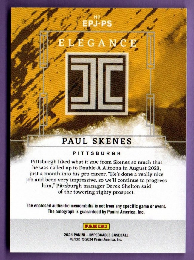 From 2024 Panini Impeccable Baseball. A Paul Skenes- Elegance- RC 2 Color Patch/On Card Autograph # 55/99 $375.00 shipped within the USA only. Thank you, Todd