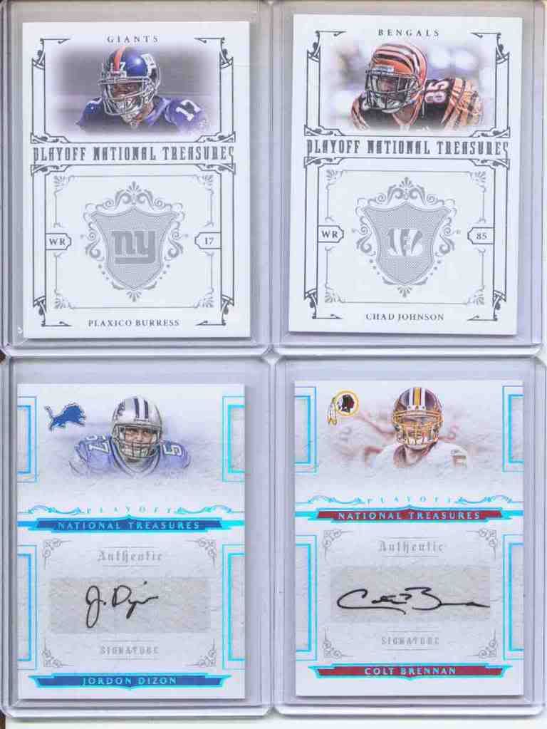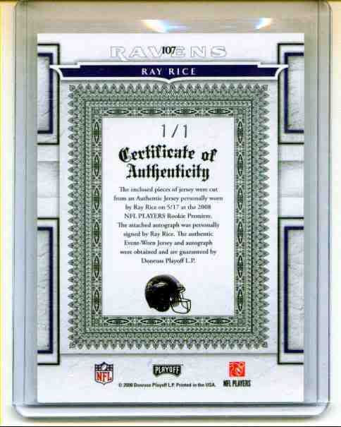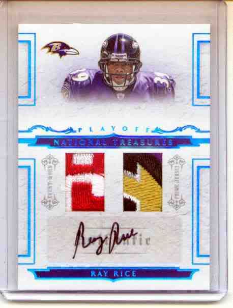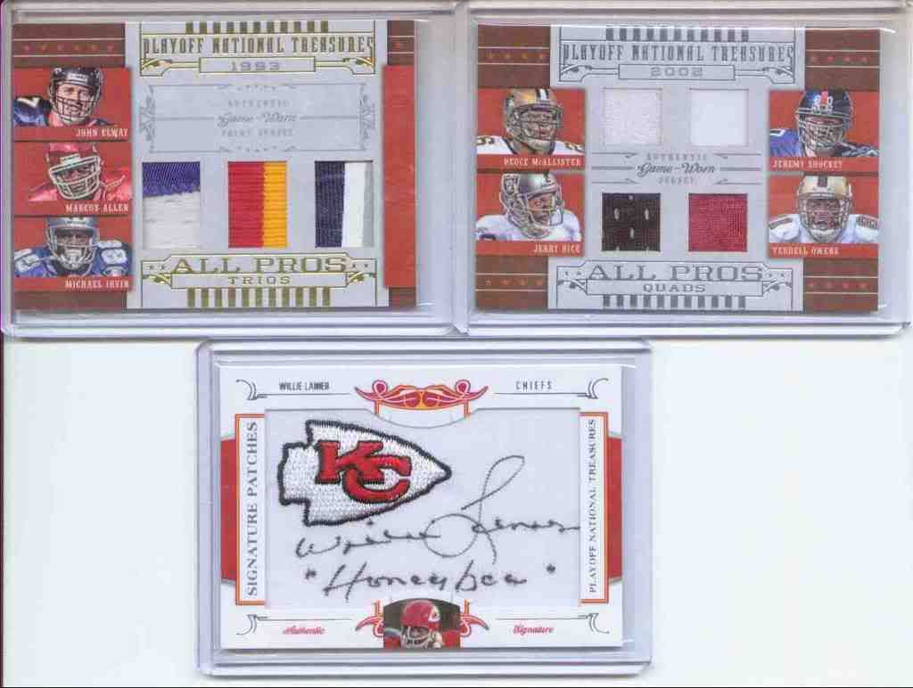 Here are the goods: Plaxico Burress Common #98/99 Chad Johnson Common #85/99 Jordan Dizon Auto RC #83/99 Colt Brennan Auto RC #27/99 Triple Patch John Elway, Marcus Allen, Michael Irvin #18/25 Quad Jersey Deuce McAllister, Jeremy Shockey, Jerry Rice, TO #02/25 Signature Patch Willie Lanier Auto #46/52 RC Auto Dual Patch Ray Rice 1/1 ![]() ![]() ![]()