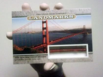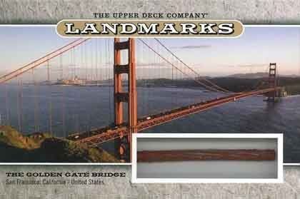 Upper Deck released some preview images of its latest memorabilia card that has been manufactured and will be headed out to collectors who found its redemption in packs of 2009 Goodwin Champions baseball cards. The Goodwin Champions Landmarks Golden Gate Bridge card, an oversized collectible, features a piece of cable from the famed bridge itself embedded into the cardboard. “The thing that makes this card a little different is the size,” said Upper Deck’s Chris Carlin. “It’s a 4×6 card that is actually a half-inch thick. It can actually stand.” The redemptions for all Landmarks cards were found just one per 12-box hobby case and are valued at $120 — though redemption holders don’t necessarily know which card they will be getting. Other cards in the set include Dead Sea salt and coal from the wreck of the Titanic, among others. Sneak peek: 2009 Goodwin Champions Landmarks Golden Gate Bridge memorabilia cards The Beckett Blog |
