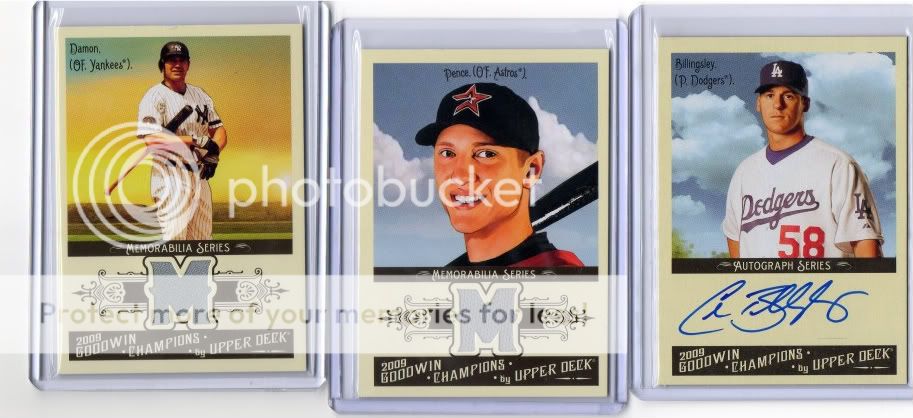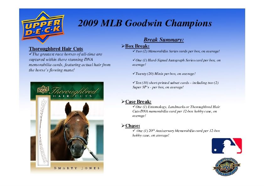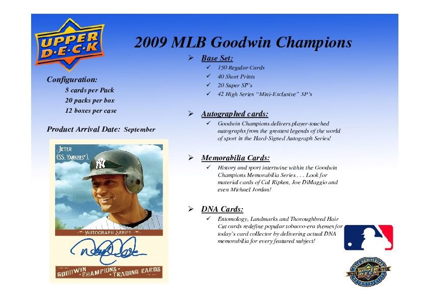 http://s655.photobucket.com/albums/u...view=slideshow Please click the links below to purchase this product by the Box or Case CASE 2009 Upper Deck Goodwin Champions Baseball Hobby 12 Box Case : Blowout Cards - Sports Cards and Trading Cards Wholesale Online Store BOX 2009 Upper Deck Goodwin Champions Baseball Hobby Box : Blowout Cards - Sports Cards and Trading Cards Wholesale Online Store 2009 Upper Deck MLB Goodwin Champions Configuration: 12 boxes per case. 20 packs per box. 5 cards per pack. The Premier Edition of Goodwin Champions Baseball will deliver stunning retro-styled images of baseball's finest active and retired stars alongside legends from the realms of surfing, thoroughbred horse racing, martial arts and more! Set collectors will have an engrossing challenge pursuing an array of high-series short-prints and minis! A slew of new-concept, DNA Memorabilia Cards will also make their debuts . . . redefining the guidelines for what can be incorporated into a trading card! CONTENT HIGHLIGHTS: - Find One (1) Mini Card (With Rare Foil Versions) In Each Pack, On Average! - Three (3) Out Of Every Four (4) Packs Will Contain An Additional Insert Or Short Print! - Collect The Entire 252 Goodwin Champions Set! - Find One (1) Hard-Signed Autograph Per Box, On Average! - Find Two (2) Memorabilia Cards Per Box Featuring Actual Relics And Materials Worn Or Used By Subjects From A Wide Realm Of Sporting And Historical Interests! - Look For Original 1888 Goodwin Champions Buybacks Including Hall Of Famers Cap Anson And King Kelly! - Look For One (1) Entomology, Landmarks, Or Thoroughbred Hair Cut "DNA/Elemental" Card Per Case, On Average! - Look For One (1) 20Th Anniversary Memorabilia Card Per Case, On Average BOX BREAK: - Two (2) Memorabilia Series cards per box, on average! - One (1) Hard-Signed Autograph Series card per box, on average! - Twenty (20) Minis per box, on average! - Ten (10) short-printed subset cards - including two (2) Super SP's - per box, on average! CASE BREAK: - One (1) Entomology, Landmarks or Thoroughbred Hair Cuts DNA memorabilia card per 12-box hobby case, on average! CHASE: - One (1) 20th Anniversary Memorabilia card per 12-box hobby case, on average! PRODUCT BREAKDOWN Base Set - Base Cards - 150 cards - Short Prints- 40 cards - Super Short Prints- 20 Cards - Mini Exclusive High Series- 42 Cards Inserts and Parallel Cards - Printing Plates (Hobby Exclusive) - Mini or Mini foil version - Mini Black Bordered Gypsy Queen Back - Mini Foil Black Bordered Magician Back (Hobby Exclusive! Limited to 8 hand numbered sets!) - Citizens of the Day - Citizens of the Century - Ten (10) 20th Anniversary cards per box, on average! - Original 1888 Goodwin Champions Buybacks Autograph Cards: (ONE PER BOX) - Goodwin Champions Hard- Signed Autograph Series - from the greatest legends of the world of sport! Memorabilia Cards: (TWO PER BOX) - Goodwin Champions Memorabilia Series - History and sport intertwine within the Goodwin Champions Memorabilia Series . . . Look for material cards of Cal Ripken, Joe DiMaggio and even Michael Jordan! Memorabilia Cards: (ONE PER CASE) - All inserts below are HOBBY EXCLUSIVE! - Entomology - A collection of DNA memorabilia cards focusing on astounding & rare butterflies and other amazing insects from across the globe! - Landmarks - These memorabilia cards feature actual elements from the most famous landmarks around the world including coal from the Titanic wreck and salt from the Dead Sea! - Thoroughbred Hair Cuts- Set of DNA memorabilia cards that will feature strands of hair from the manes of some of the world's most-famed racing horses! Look for hair from the likes of Afleet Alex, Funny Cide and the legendary Smarty Jones! 20th Anniversary Memorabilia Cards: (ONE PER CASE) - 20th Anniversary Memorabilia View Sell Sheet Info* *Microsoft Power Point required to view file. ![]() ![]()