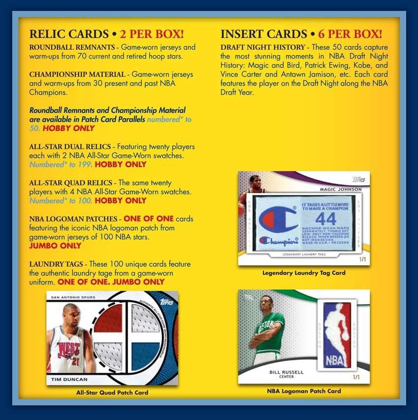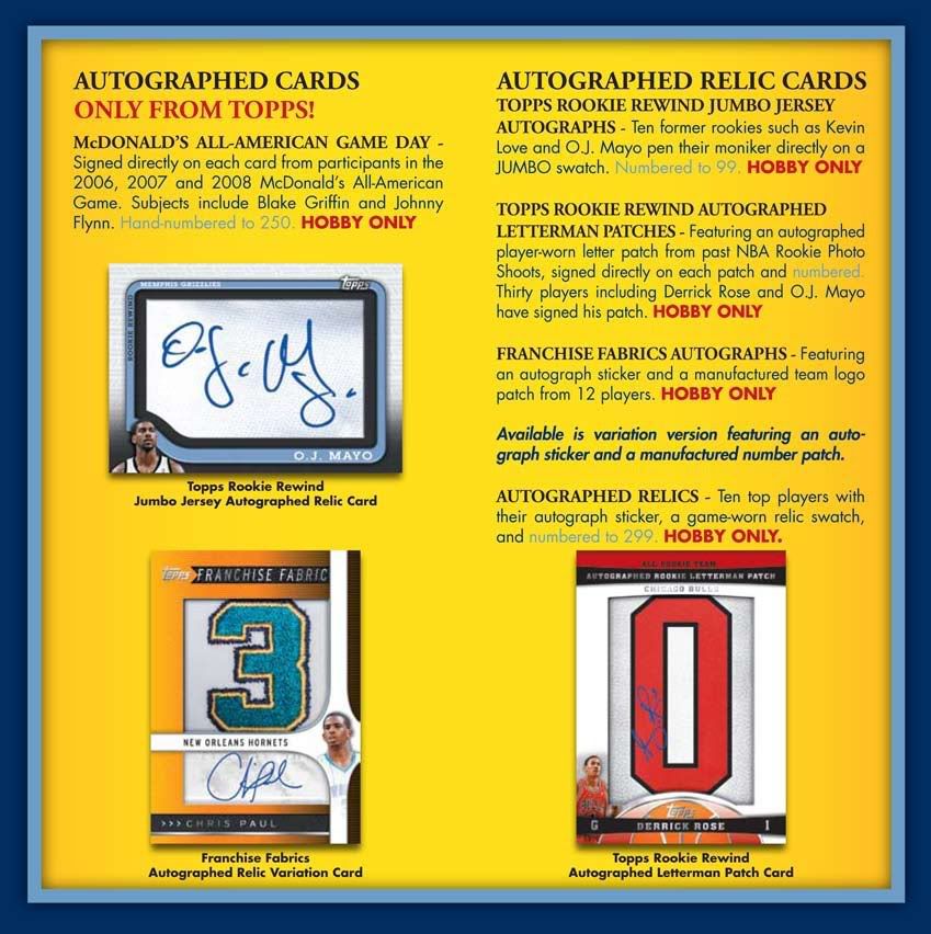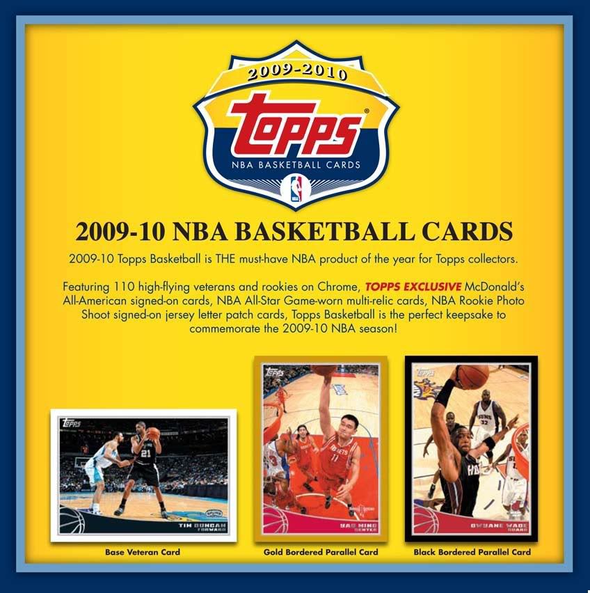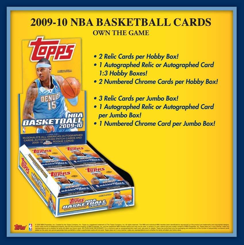 Hobby Case 2009/10 Topps Basketball Hobby 12 Box Case : Blowout Cards - Sports Cards and Trading Cards Wholesale Online Store Hobby Box 2009/10 Topps Basketball Hobby Box : Blowout Cards - Sports Cards and Trading Cards Wholesale Online Store Jumbo Case 2009/10 Topps Basketball Jumbo HTA 6 Box Case : Blowout Cards - Sports Cards and Trading Cards Wholesale Online Store Jumbo Box 2009/10 Topps Basketball Jumbo HTA Box : Blowout Cards - Sports Cards and Trading Cards Wholesale Online Store 2009/10 TOPPS BASKETBALL TOPPS BASKETBALL features NBA Rookies, 110 Topps Chrome subjects, along with a collection of Autograph, Relic and Autographed Relic Cards! Configuration: 12 boxes/36 packs/10 cards* * Each pack contains 9 Topps Basketball Cards plus one (1) Parallel Card! SRP: $1.99/pack PRODUCT HIGHLIGHTS: * 110 HIGH-FLYING CHROME ROOKIES & VETERANS! * TOPPS EXCLUSIVE MCDONALD’S ALL-AMERICAN SIGNED-ON CARDS! * NBA ALL-STAR GAME-WORN MULTI-RELIC CARDS! * NBA ROOKIE PHOTO SHOOT SIGNED-ON JERSEY LETTER PATCH CARDS! REGULAR BOX BREAK CONTENT: * 2 Relic Cards per Hobby Box! * 1 Autograph Relic or Autograph Card 1:3 Hobby Boxes! * 2 Numbered Chrome Cards per Hobby Box! BASE CARDS - 330 cards - 9 per Hobby Pack Veterans (315) Rookies (15) PARALLEL CARDS - 1,980 cards - 1 per Hobby Pack Black (330) - #’d to 50 Gold (330) - #’d to 2009 Printing Plates (1,320) - Each is a 1 of 1 Hobby & Jumbo Only! TOPPS CHROME - 440 cards - 9 per Hobby Box Super-Fractor (110) - Each is a 1 of 1; Hobby & Jumbo Only Gold (110) - #’d to 50 Refractor (110) - #’d to 500 Chrome (110) - #’d to 999 RELIC CARDS - 440 cards - 2 per Hobby Box Roundball Remnants (70) Championship Material (30) - Patch Card Parallels of above (100) - #’d to 50; Hobby & Jumbo Only All-Star Dual (20) - #’d to 199; Hobby & Jumbo Only All-Star Quad (20) - - #’d to 100; Hobby & Jumbo Only INSERT CARDS - 50 cards - 6 per Hobby Box Draft Night History (50) ON-CARD AUTOGRAPHS - TBD cards - 1 Autograph Relic/Autograph Card 1:3 Hobby Boxes! McDonald’s All-American (TBD) - Hand #’d to 250 AUTOGRAPHED RELIC CARDS - 74 cards - 1 Autograph Relic/Autograph Card 1:3 Hobby Boxes! Rookie Rewind Jumbo Jersey Autographs (10) - #’d to 99; Hobby & Jumbo Only Rookie Rewind Letterman Patch Autographs (30) - #’d; Hobby & Jumbo Only Franchise Fabrics Autographs (12) - Autograph Number Variation (12) Autograph Relics (10) - #’d to 299; Hobby & Jumbo Only Release Date: 08/26/2009 09/10 TOPPS BASKETBALL JUMBO TOPPS BASKETBALL features NBA Rookies, 110 Topps Chrome subjects, along with a collection of Autograph, Relic and Autographed Relic Cards! Configuration: 6 boxes/10 packs/50 cards* * Each pack contains 44 Topps Basketball Cards, PLUS one (1) Draft Night History card, PLUS one (1) Chrome card, PLUS four (4) Parallel Cards! SRP: $10.00/pack PRODUCT HIGHLIGHTS: * 110 HIGH-FLYING CHROME ROOKIES & VETERANS! * TOPPS EXCLUSIVE MCDONALD’S ALL-AMERICAN SIGNED-ON CARDS! * NBA ALL-STAR GAME-WORN MULTI-RELIC CARDS! * NBA ROOKIE PHOTO SHOOT SIGNED-ON JERSEY LETTER PATCH CARDS! JUMBO BOX BREAK CONTENT: * 3 Relic Cards per Jumbo Box! * 1 Autograph Relic or Autograph Card per Jumbo Box! * 1 Numbered Chrome Card per Jumbo Pack! BASE CARDS - 330 cards - 44 per Jumbo Pack Veterans (315) Rookies (15) PARALLEL CARDS - 1,980 cards - 4 Per Jumbo Pack Black (330) - #’d to 50 Gold (330) - #’d to 2009 Printing Plates (1,320) - Each is a 1 of 1 - Hobby & Jumbo Only! TOPPS CHROME - 440 cards - 1 per Jumbo Pack Super-Fractor (110) - Each is a 1 of 1; Hobby & Jumbo Only Gold (110) - #’d to 50 Refractor (110) - #’d to 500 Chrome (110) - #’d to 999 RELIC CARDS - 440 cards - 3 Per Jumbo Pack Roundball Remnants (70) Championship Material (30) - Patch Card Parallels of above (100) - #’d to 50; Hobby & Jumbo Only All-Star Dual (20) - #’d to 199; Hobby & Jumbo Only All-Star Quad (20) - - #’d to 100; Hobby & Jumbo Only NBA Logoman Patches (100) - Each is a 1 of 1; Jumbo Only Laundry Tags (100) - Each is a 1 of 1; Jumbo Only INSERT CARDS - 50 cards - 1 Per Jumbo Pack Draft Night History (50) ON-CARD AUTOGRAPHS - TBD cards - 1 Autograph Relic/Autograph Card per Jumbo Box! McDonald’s All-American (TBD) - Hand #’d to 250 AUTOGRAPHED RELIC CARDS - 74 cards - 1 Autograph Relic/Autograph Card per Jumbo Box! Rookie Rewind Jumbo Jersey Autographs (10) - #’d to 99; Hobby & Jumbo Only Rookie Rewind Letterman Patch Autographs (30) - #’d; Hobby & Jumbo Only Franchise Fabrics Autographs (12) - Autograph Number Variation (12) Autograph Relics (10) - #’d to 299; Hobby & Jumbo Only ![]() ![]() ![]() ![]() ![]()