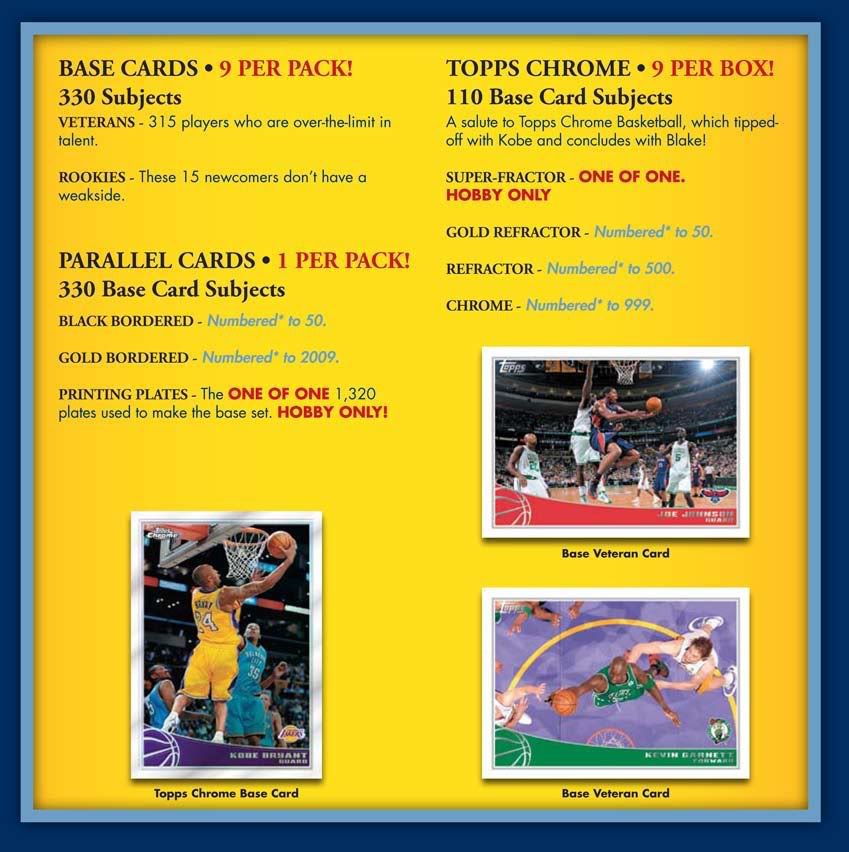 Gold /2009 Brandon Jennings RC Tyler Hansbrough RC Stephen Curry RC Hasheem Thabeet RC Jordan Hill RC (x2) Jrue Holiday RC Demar Derozan RC Blake Griffin RC Gerald Henderson RC James Harden RC Terrence Williams RC Ricky Rubio RC Jonny Flynn RC Black /50 Garnett Duhon Udrih Raja Bell Brandon Jennings RC Willie Green Mo Peterson Chrome /999 Hansbrough RC Thabeet RC Griffin RC Chrome Refractor /500 Flynn RC Gold Refractor /50 Kobe Bryant Lamarcus Aldridge Kevin Love Rudy Fernandez All Star Jersey Dual /199 Pau Gasol Amare Stoudemire Vince Carter Rip Hamilton All Star Jersey Quad /100 Rip Hamilton Pau Gasol Championship Material GU jerseys Isiah Thomas Andrew Bynum Sam Cassell Rip Hamilton Scottie Pippen (damaged) Championship Material Patch /50 Magic Johnson Roundball Remnants Patch /50 Lamarcus Aldridge Vince Carter (damaged) Printing Plate 1/1 Keith Bogans McDonald's Autographs Gerald Henderson Chase Budinger Brandon Jennings Jrue Holiday BJ Mullens Auto Jersey /299 Brandon Roy Luke Walton